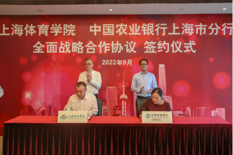 本网讯 9月28日上午,上海体育学院与中国农业银行上海市分行举行全面战略合作协议签约仪式。上海体育学院党委书记李崟,中国农业银行上海市分行党委书记、行长陈其昌,党委委员、副行长王蓓,上海体育学院党委副书记、副院长王继红,人事处处长焦振伦,财务处处长杨倩,后勤处处长徐烈、发展规划处副处长兼信息化办公室副主任卢文云(主持工作)等参加签约仪式。