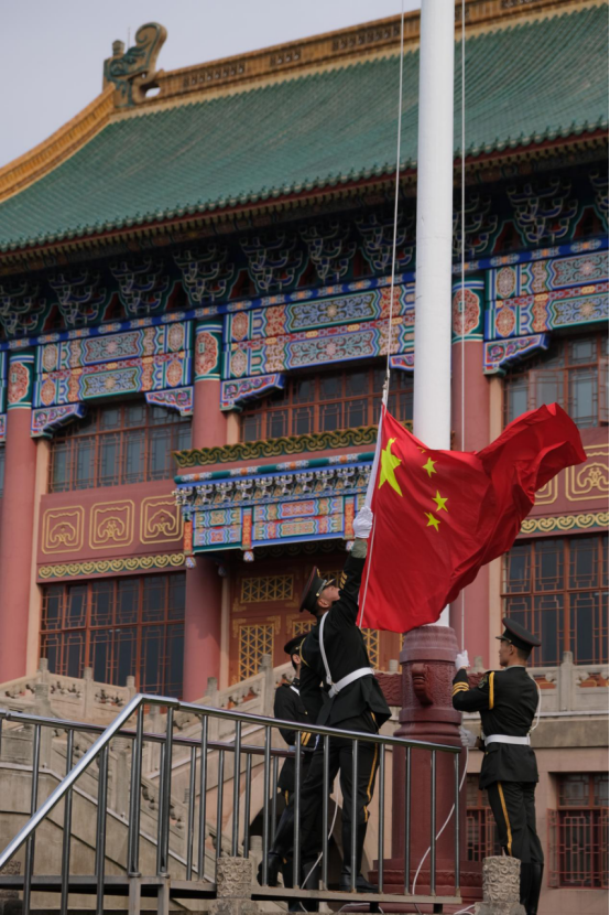 唱着雄壮激昂的国歌,目睹着五星红旗冉冉升起,上海体育学院在绿瓦大楼前举行升旗仪式。