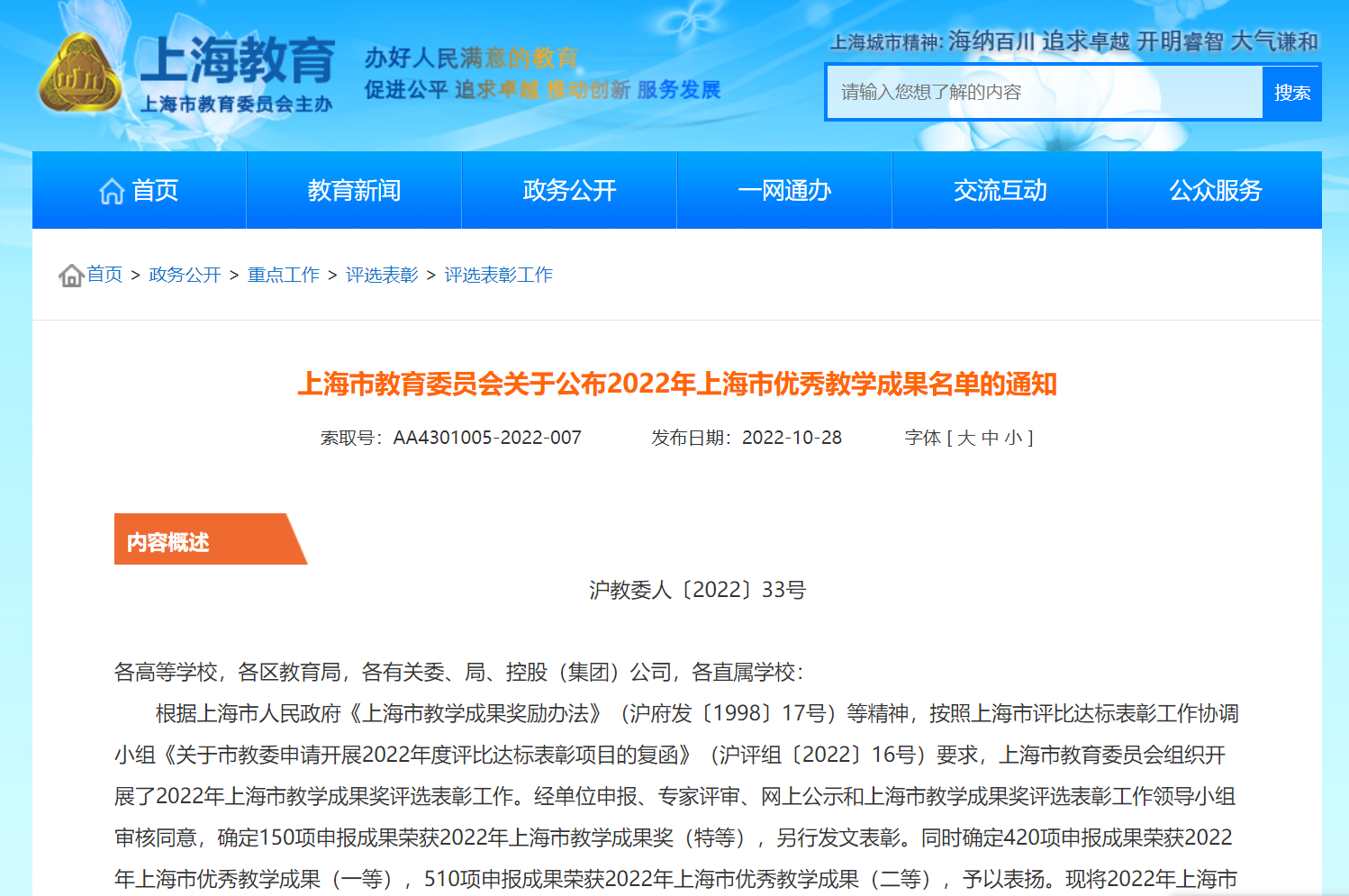 本网讯 近日,《上海市教育委员会关于公布2022年上海市优秀教学成果奖名单的通知》(沪教委人[2022]33号),正式公布了2022年上海市级教学成果奖评审结果。经单位申报、专家评审、网上公示和上海市教学成果奖评选表彰工作领导小组审核等程序,共评选出特等奖150项,一等奖420项,二等奖510项。我校共荣获上海市级教学成果奖12项,其中作为第一完成单位荣获特等奖2项,一等奖4项,二等奖5项;作为合作完成单位荣获一等奖1项。覆盖高等教育、基础教育和职业教育所有层次,获奖总数取得历史性突破。