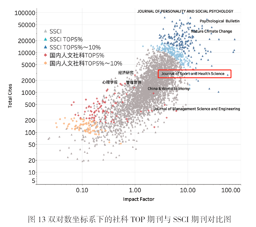 《年报》对中国人文社科期刊计算了国际他引总被引频次、国际他引影响因子、期刊影响力指数(CI)等指标,在满足“国际他引总被引频次和国际他引影响因子排名均位于前20%”的条件下,最终按CI排序遴选了TOP10%为国际影响力品牌学术期刊(以下简称“TOP期刊”)。其中,TOP5%以内的为“中国最具国际影响力学术期刊”(80种),TOP5%-10%的为“中国国际影响力优秀学术期刊”(80种)。JSHS以1414.214的高分(CI)稳居“中国最具国际影响力学术期刊”榜首。《年报》还将这160种期刊与科睿唯安(Clarivate Analytics)发布的2021年《期刊引证报告》(JCR)中6000余种SSCI期刊汇总在一起,计算各刊的影响力指数CI,并进行对比分析,结果显示“Journal of Sport and Health Science已达到SSCI期刊TOP水平,整体表现优于去年,进一步稳固了国际一流期刊的位置”(摘自《年报》原文)。