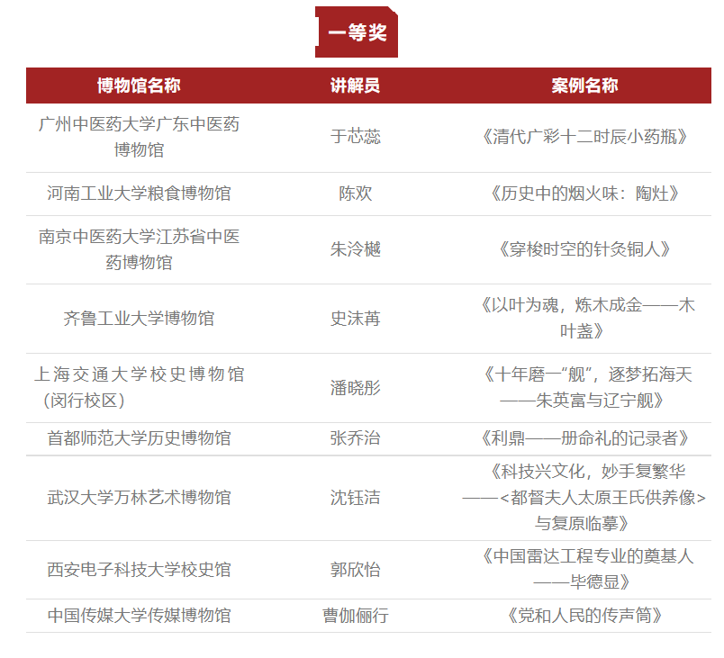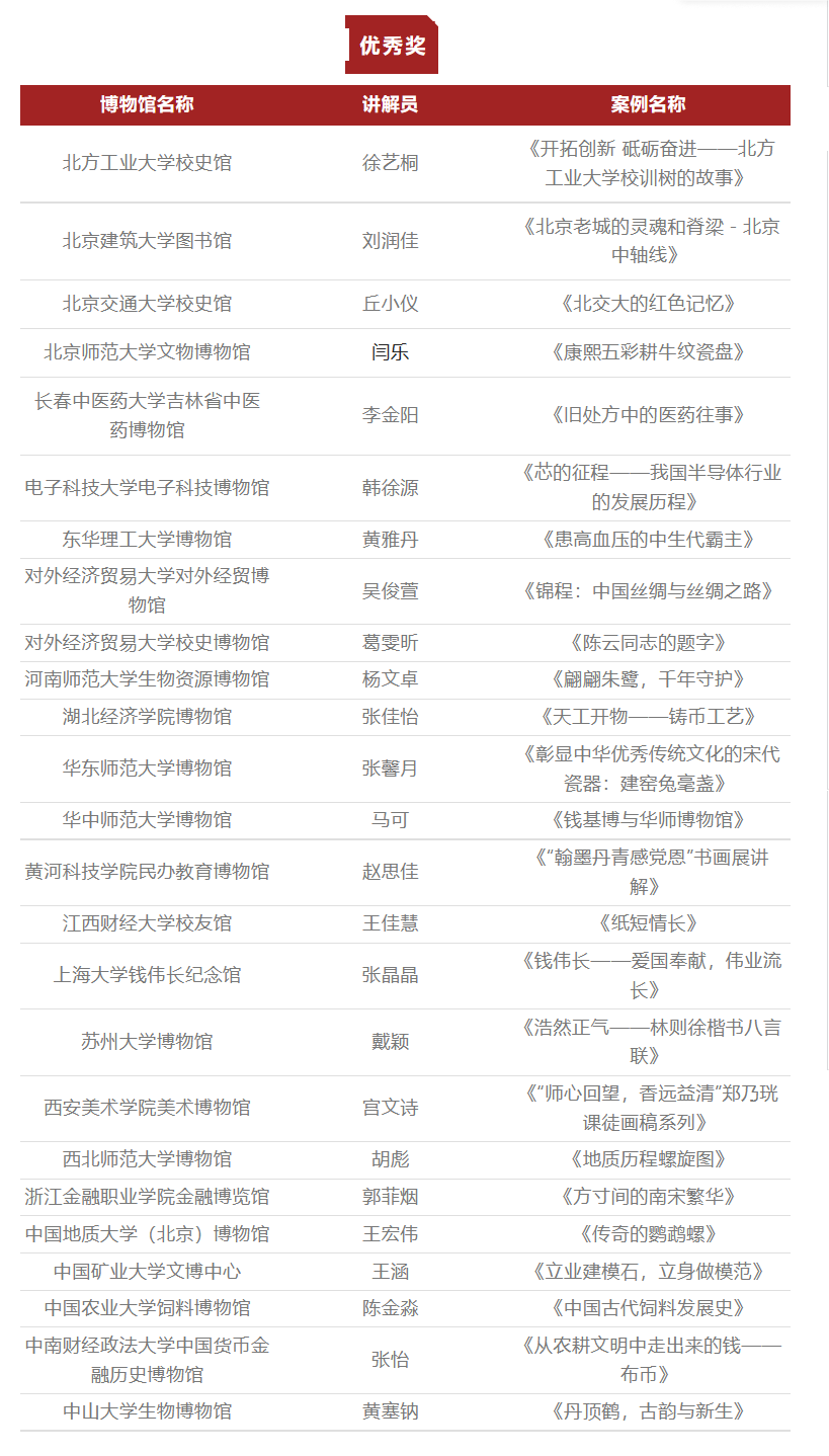 本网讯 经国家文物局批准,由中国博物馆协会、北京博物馆学会主办,北京博物馆学会高校博物馆专业委员会、新媒体与传播专业委员会承办,中国传媒大学传媒博物馆、人民文博协办的第六届(2022年度)全国高校博物馆讲解案例征集展示活动,自2022年11月正式启动,共有全国各地87所高校博物馆参加申报,作品主题、体裁、规模和质量都创历届新高。经过评审专家最终评审,共评选一等奖9名、二等奖18名、三等奖35名、优秀奖25名,同时评选出优秀视频制作、优秀策划创意、优秀融媒传播、优秀指导教师奖各5名。