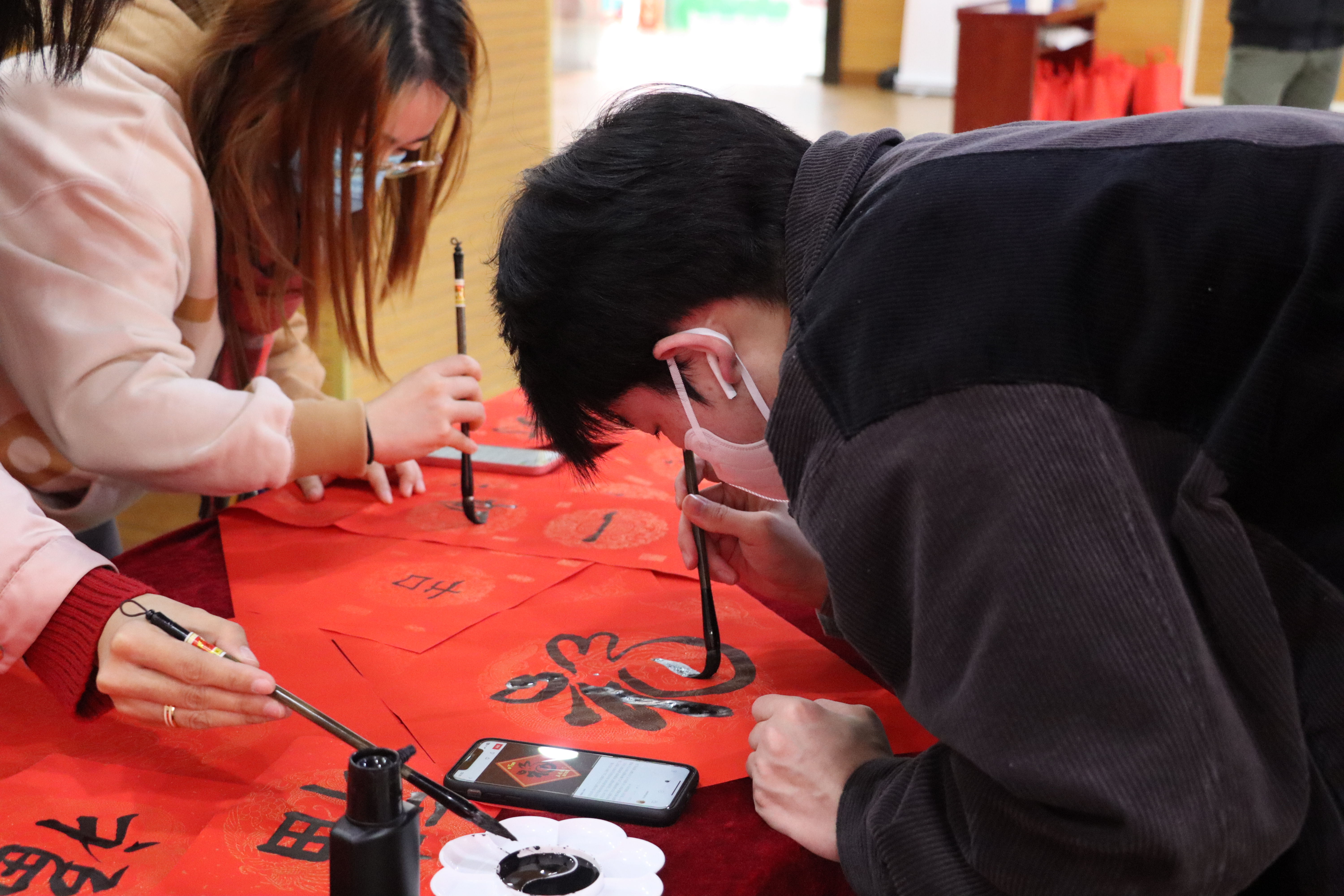 阵阵墨香指尖流,幽幽韵味心脾沁。活动现场,春联纸、笔墨被整齐地摆放在桌子上,鲜红的纸张渲染着浓浓的节日氛围。一笔一墨、一横一竖、一撇一捺,一副副写满新年祝福的春联和“福”字,写的是汉字,报的是节讯,暖的是人心,留校师生饱含着真情,于黑墨红纸间感受着笔墨丹青的独特魅力,浸润的是中华优秀文化,续写的是美好新年祝愿。
