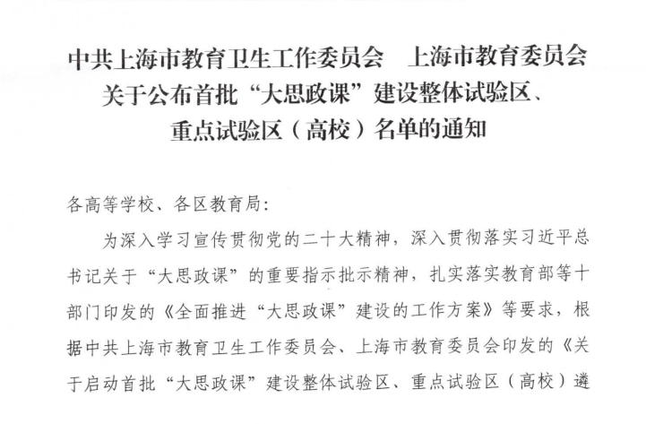 本网讯 近日,上海市教卫工作党委、市教委公布了首批“大思政课”建设整体试验区、重点试验区(高校)名单,我校成功入选首批上海“大思政课”建设重点试验高校。