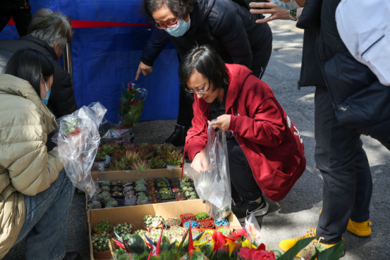 今年的服务活动相较往年更加丰富,包括“爱绿护绿”平价花卉售卖、平价菜售卖和“美化清洁校园”志愿服务。3月3日中午,物业部在第一、二餐厅前摆放多肉盆栽、仙客来、红掌、星型凤梨、发财树等各类绿植,吸引了众多师生、员工驻足观赏与选购。