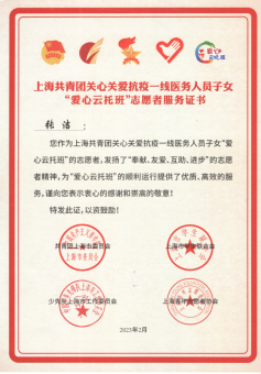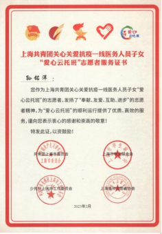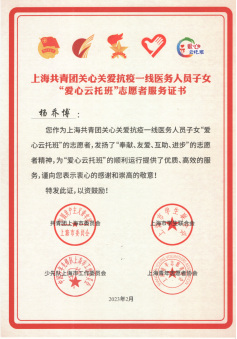 为积极响应团市委的号召,我校结合本校体育专业特色,由体育教育学院杨乔博、张洁与孙铭洋三名师生为小朋友们编排录制了一系列的精品操舞课程,如武术健身操之《中国少年说》、武术健身操之《少林英雄》、花球啦啦操之《一起向未来》、街舞啦啦操之《孤勇者》,在强身健体的同时也弘扬了中华体育精神和体育文化。课程视频录制成果得到了团市委的肯定,并被青春上海报道。三位优秀志愿者也获得了团市委“爱心云托班”志愿者服务证书。