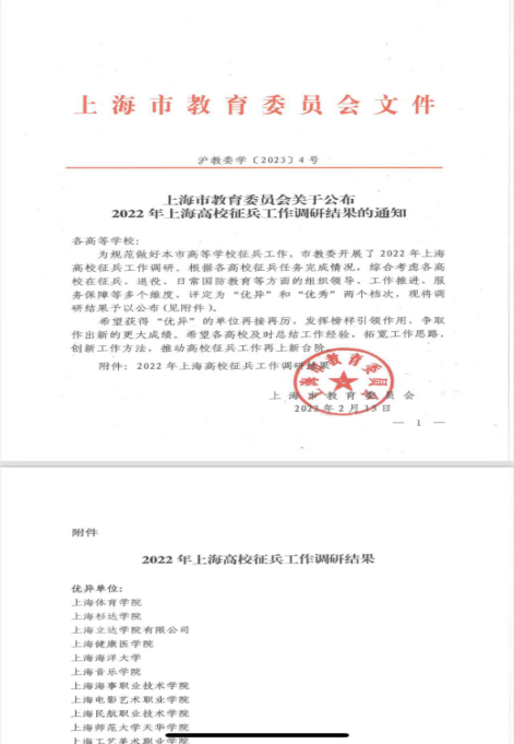 本网讯 2月23日下午,在2022年上海市高校征兵督导调研工作总结会上,市教委宣读了《2022年上海高校征兵工作调研结果的通知》,根据各高校征兵任务完成情况,综合考虑各高校在征兵、退役、日常国防教育等方面的组织领导、工作推进、服务保障等多个维度,评定为"优异"和"优秀"两个档次,我校荣获“优异”称号。