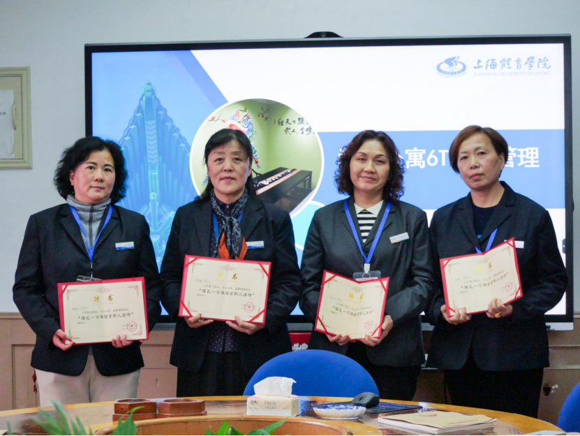 在袁老师为同学们讲述了上体宿舍的基本情况之后,金娟、刘晓春、李小芳、缪海庆四位宿管阿姨分别上台进行了自我介绍,简单地介绍了她们各自所负责的楼宇以及楼宇的基本情况,讲述各自的管理理念和与学生相处的方法,在介绍的过程中四位阿姨都讲了许多发生在宿舍的温情故事,让参与本次实践学习活动的同学都从她们的言语和行动中感觉到宿管阿姨为了我们营造家一般的宿舍的决心与恒心。在学生活动中心门口进行了集体的合影留念后,对参与活动的学生进行了分组,学员们分别跟随四位宿管老师进入到学生宿舍体验学习宿管阿姨的每日工作。