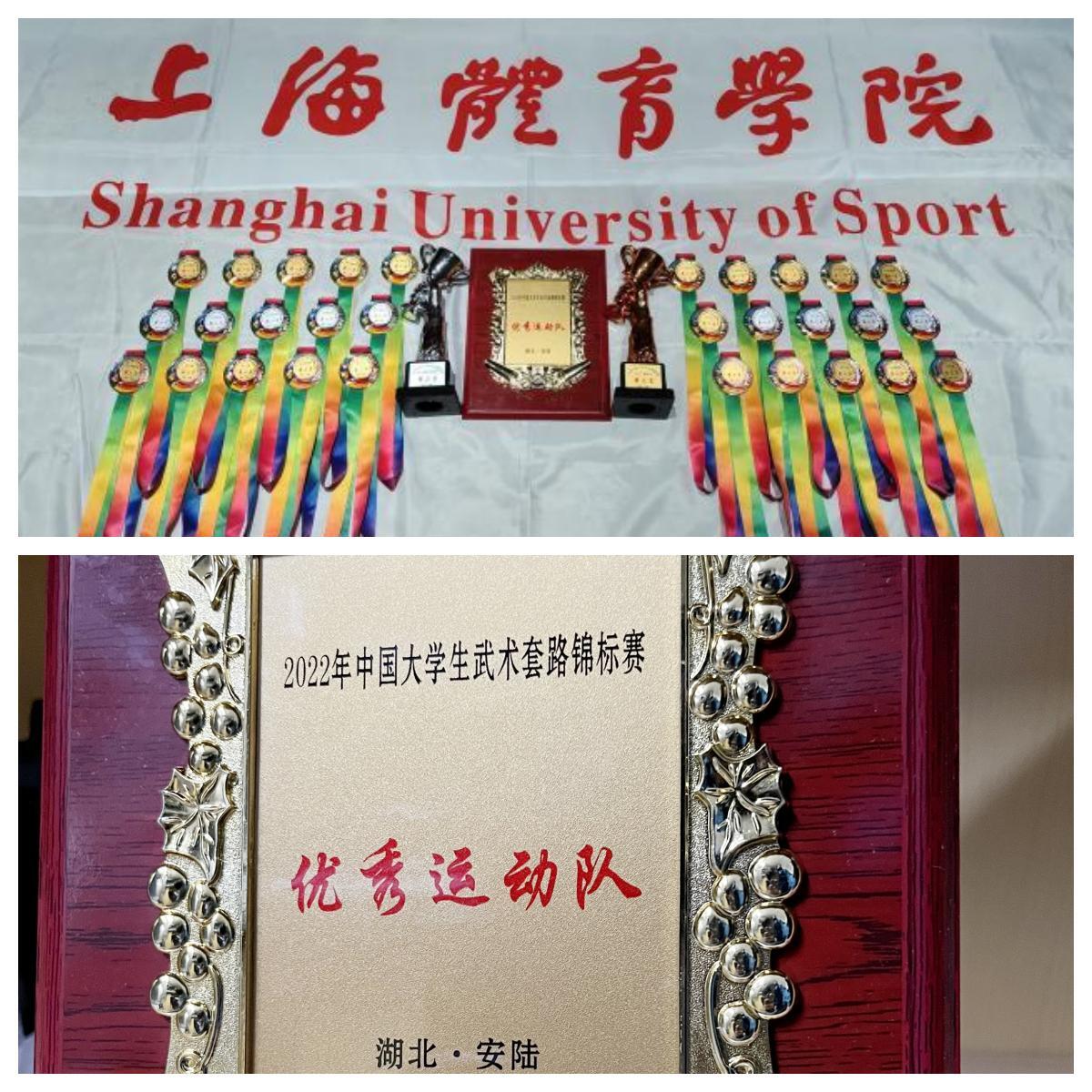 本网讯 2023年4月1日至4日,2022年中国大学生武术套路锦标赛(丙组、丁组)在湖北省安陆市盛大举行。来自清华大学、复旦大学、浙江大学、华中科技大学、澳门大学、中国人民大学等67所高校77支代表队参加比赛,另外来自马来西亚、新加坡的武术代表队也前来参加学习交流和试艺,共计900余人齐聚湖北以武会友。上海体育学院共计斩获金牌11枚,银牌9枚,铜牌12枚,代表队以优异成绩获得优秀运动队荣誉,武术学院席饼嗣老师获得“优秀教练员”称号