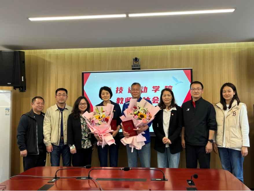 本网讯 4月20日下午,一场温馨而隆重的退休教师荣休会在竞技运动学院徐汇校区二楼会议室举行,大家共同祝福韦蓓老师、沈建廷老师光荣退休,开启新的人生阶段。上海体育学院党委副书记杨玲、竞技运动学院党政班子出席会议。会议由竞技运动学院党委书记殷勤主持。