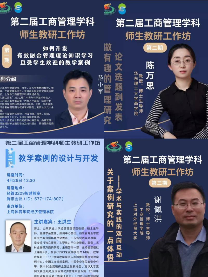 经济管理学院第二届工商管理学科师生教研工作坊以案例为主题启动系列讲座,以线上线下结合方式先后邀请上海大学管理学院范小军教授《如何开发有效融合管理理论知识学习且受学生欢迎的教学案例》、上海对外经贸大学工商管理学院谢佩洪教授《关于案例研究的一点体悟——学术与实践的双向互动》、华东理工大学商学院陈万思教授《做有趣的管理研究——论文选题到发表》、山东农业大学经济管理学院王洪生教授《教学案例选题与撰写》等四场讲座,师生互动热烈。