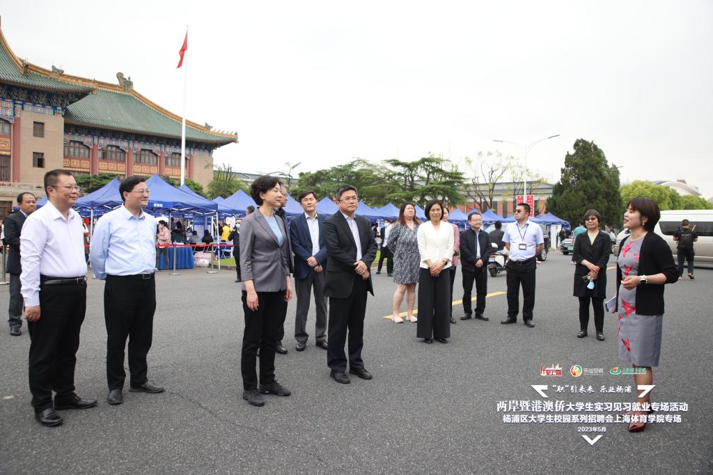 市人社局党组书记、局长杨佳瑛,区委书记、区长薛侃,上海体育学院党委副书记、院长毛丽娟,市教委副主任王浩,市台办副主任李骁东,市就业促进中心主任周国良,区委常委董鑫旺,副区长于洋共同调研招聘会现场。