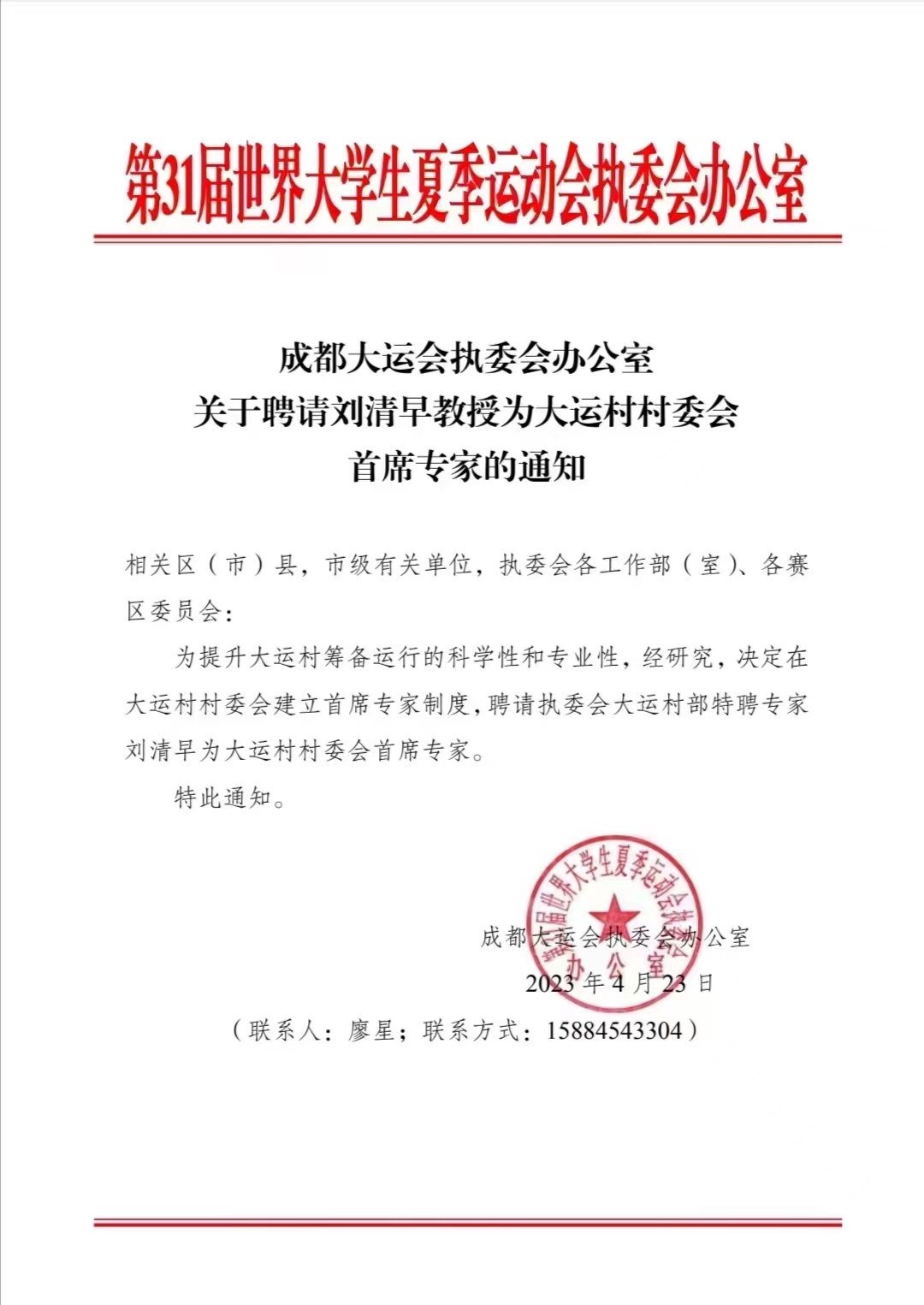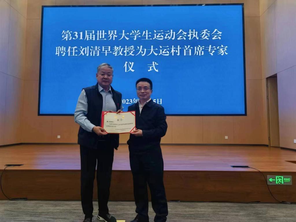 本网讯 在第31届世界大学生运动会开幕倒计时100天之际,中共成都市委常委、大运会执委会党组书记鲜荣生亲自主持仪式,为我校刘清早教授颁发“第31届世界大学生夏季运动会运动员村首席专家”聘书。刘清早教授将带领学生团队为大运村的成功运行提供专业技术服务。“第31届世大运会”将于今年7月28日在成都开幕,此前,刘清早教授已经担任大运会执委会特聘专家。