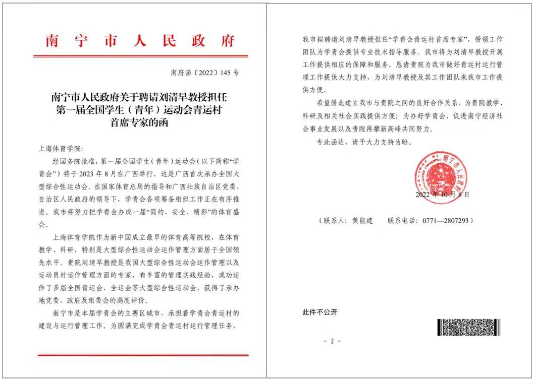 第一届全国学生(青年)运动会将于今年11月在广西举行,刘清早教授受南宁市人民政府邀请,担任了“第一届全国学生(青年)运动会运动员村首席专家”。日前,在“运动员村竣工暨村委会揭牌仪式”上,南宁市人民政府副秘书长、运动员村村长罗景文亲自向刘清早教授颁发聘书。刘清早教授将带领学生团队为“最大的公寓式接待宾馆集群”组成的运动员村的运行管理全程提供专业技术指导。