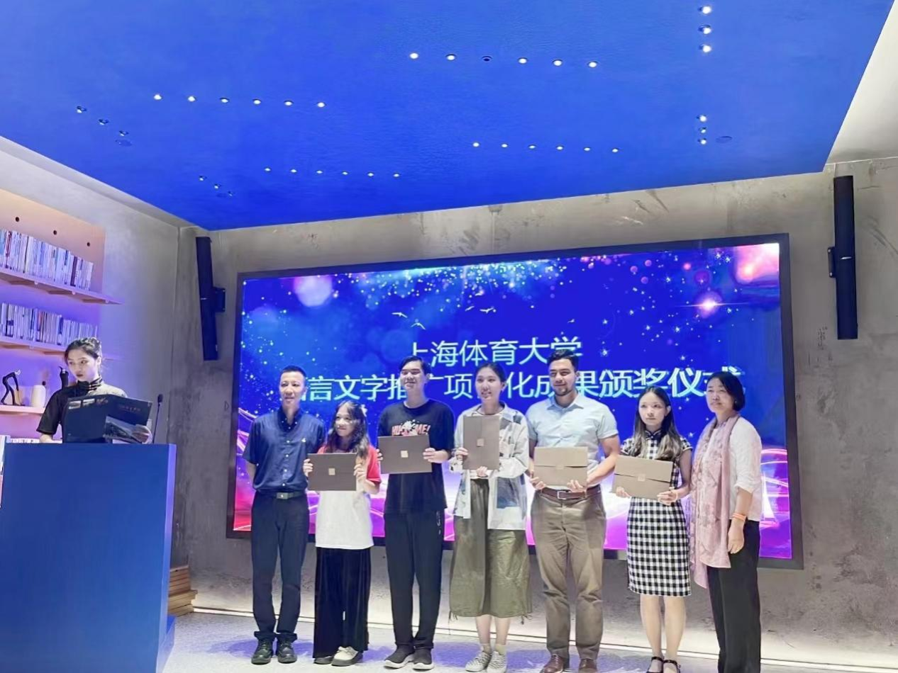 在jinnian金年会语言文字推广项目化成果展活动中,汉语国际教育专业师生汇报了“以体为媒——留学生语言文字能力提升”、“上体大语言文字创新推广”、“我们一起讲上体故事”、“运动员语言文字能力提升工作坊”、“语言景观——校园语言文字诊断”五个语言文字推广项目化成果,这些项目辐射到我校学生、学校退休教师、上海高校留学生、上海申花女足等多个群体,以体育特色鲜明、形式多样的方式,探索出了语言文字推广的创新样态。在为期两周的项目化学习过程中,汉语国际教育专业的同学们将平日课堂上学到的理论知识付诸实践,真正做到了“学以致用”。学生们团队协作能力以及沟通交流能力也在各种活动的组织过程中获得了长足的进步。展演活动后,高艳丽和胡晨为项目团队颁发了“最佳团队合作奖”“最佳推广策划奖”“最佳视觉效果奖”“最佳创意执行奖”“最佳教学实践奖”等五个奖项。