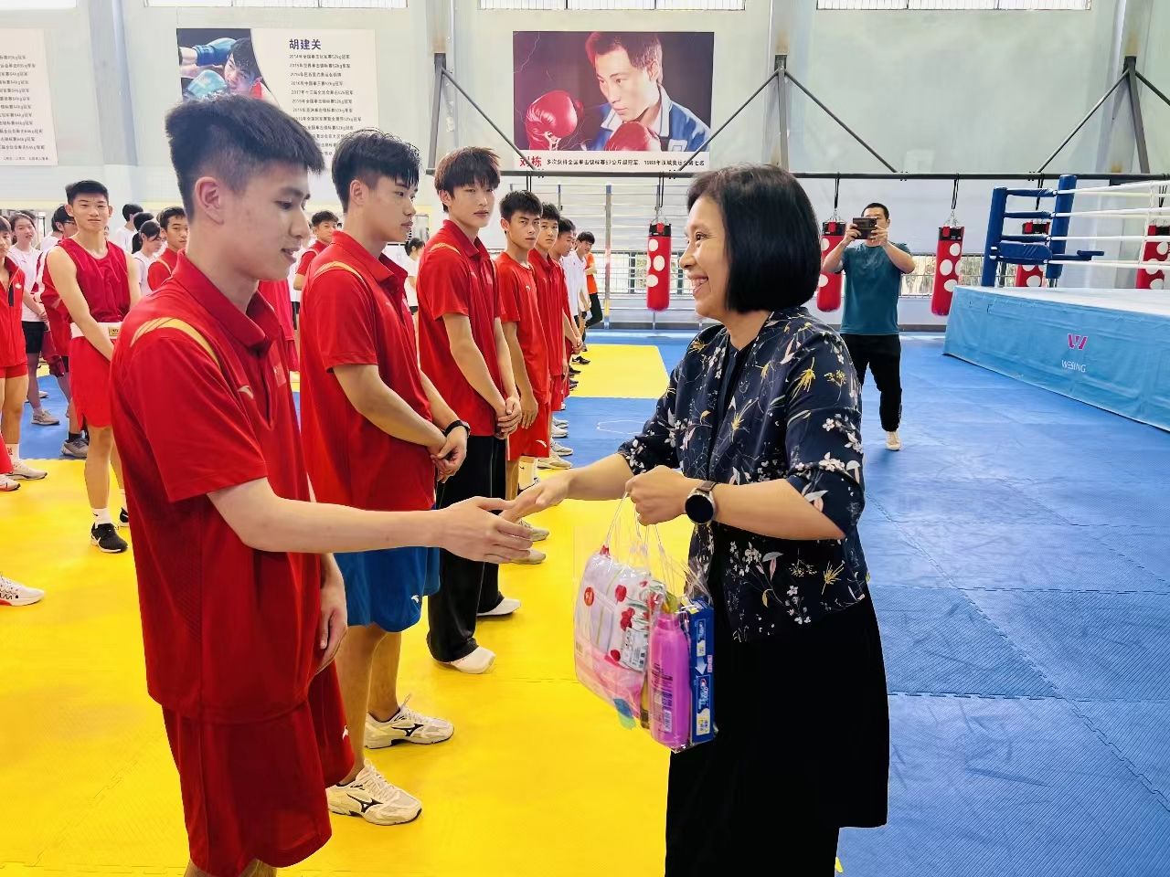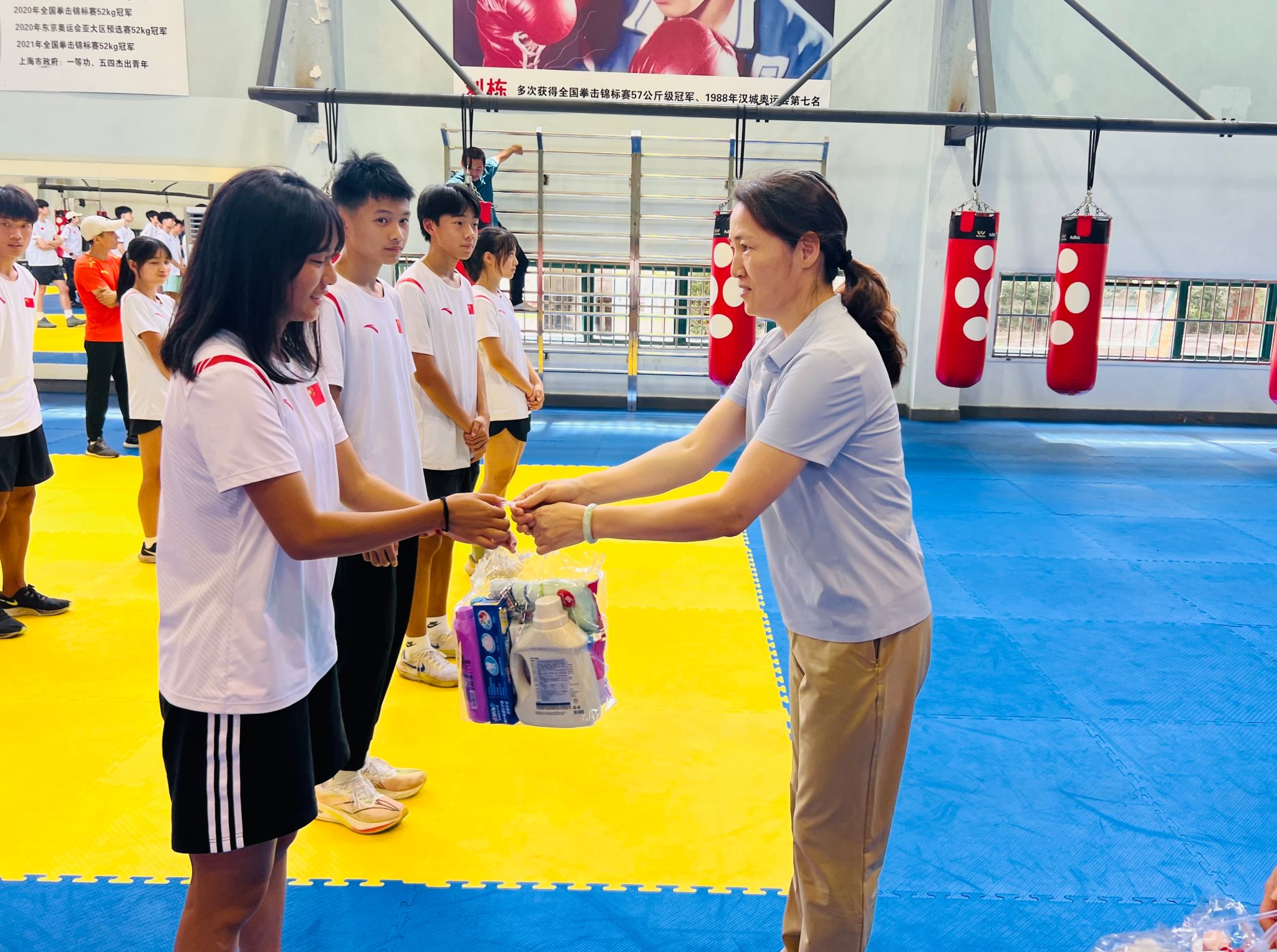 毛丽娟、杨玲为运动员、教练员和保障人员送上了防暑降温慰问品。