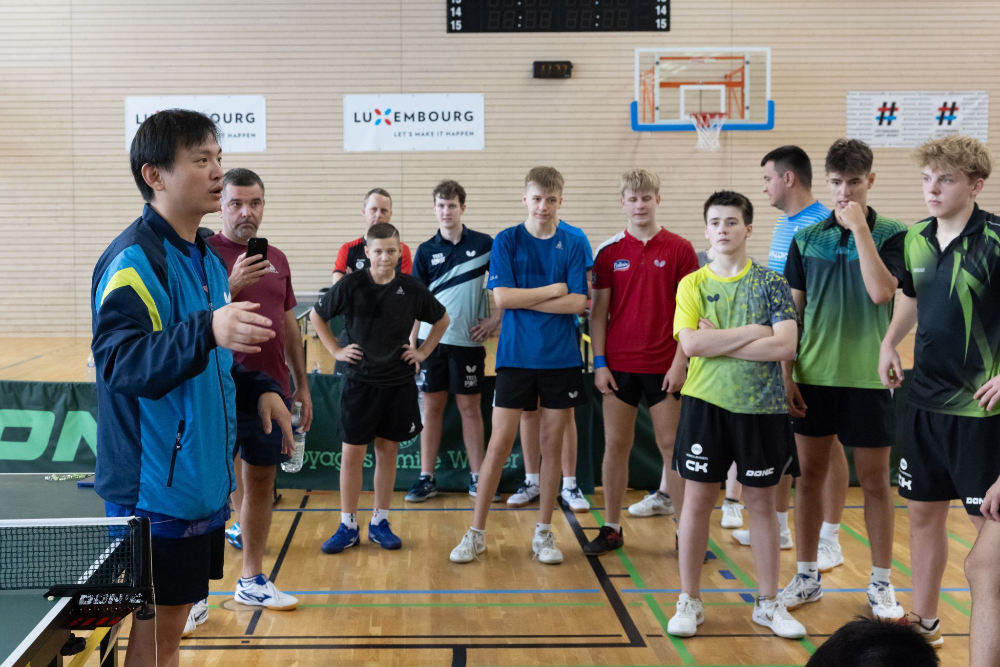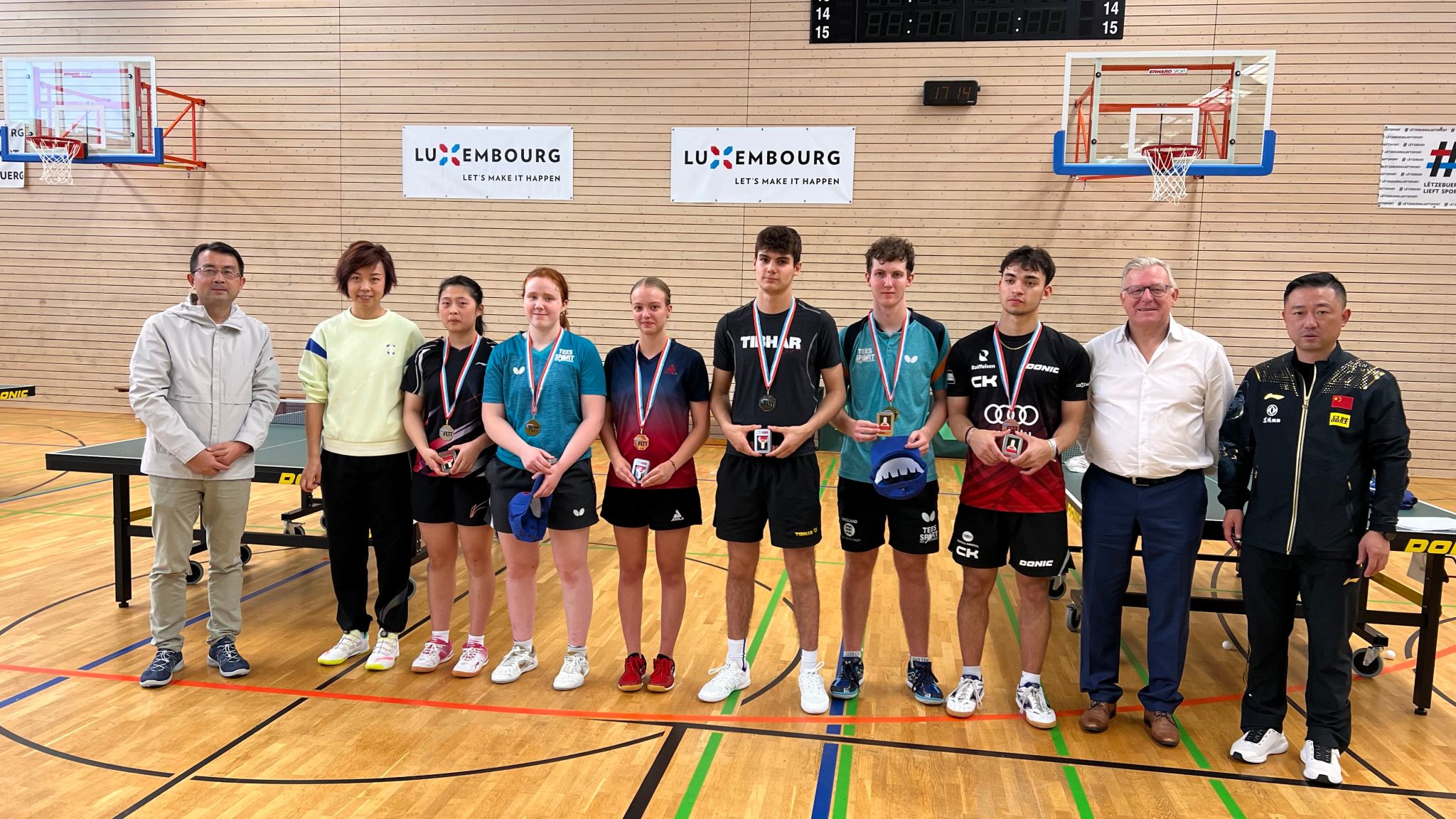 (华宁大使、卢森堡乒协主席哈特曼与训练营教练员运动员合影)