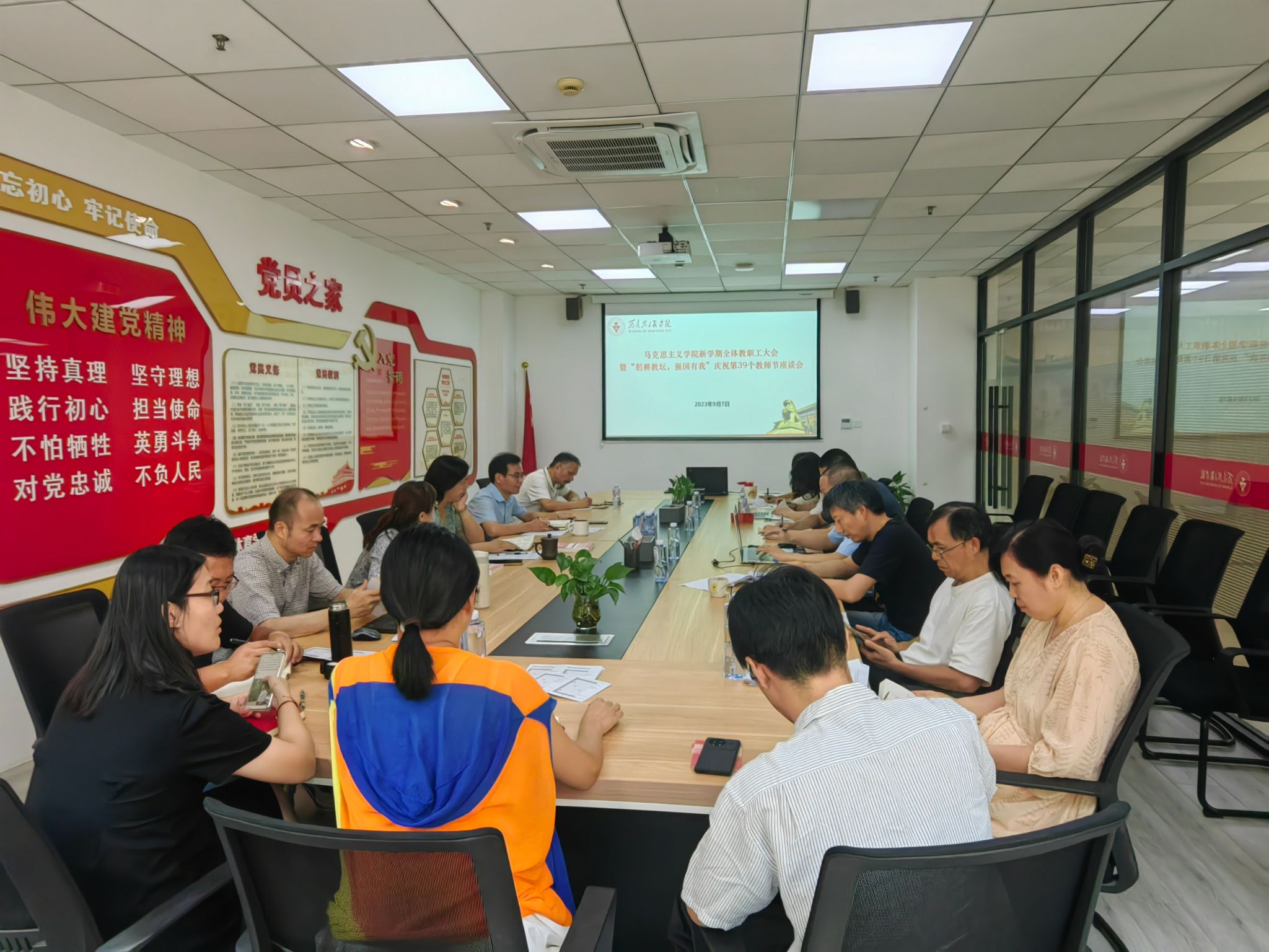 本网讯 9月7日下午,马克思主义学院新学期教职工大会暨“躬耕教坛,强国有我”第39个教师节座谈会在123会议室举行,布置新学期各项工作,迎接第39个教师节的到来。学院直属党支部书记、院长胡德平主持会议,并转达了党委书记李崟对学院全体教师的节日慰问和祝福。李崟对学院上半年工作给予了充分肯定,要求下半年要扎实做好主题教育“后半篇文章”,把主题教育成果体现到学院高质量发展上。