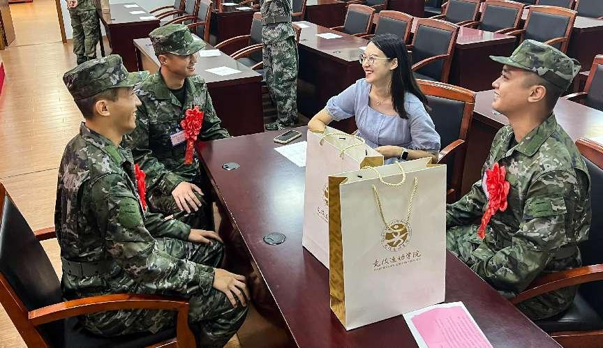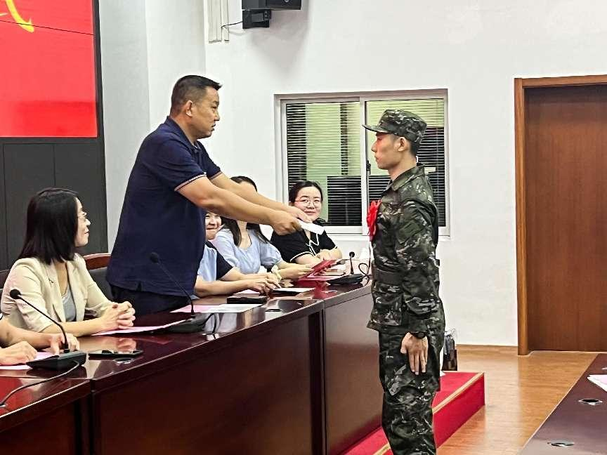 武装部部长王丽娜在会上宣读了2023年秋季征兵定兵名单,鼓励新兵们要坚守初心,牢记使命,要坚定从军报国的理想,把热血挥洒在实现强军梦的伟大实践中;要坚持学习,建设国防,努力成长为高素质专业化新型军事人才,为国防和军队现代化贡献力量;要坚定自信,不负韶华,在军队这个大舞台上施展才华,在军营这个大熔炉里淬炼成钢,书写绚烂、无悔的青春篇章。希望新兵们时刻秉承“身心一统、兼蓄竞攀”的校训,发挥专业特长,以优异的成绩为母校增光添彩,学校永远是你们最坚实的后盾。各学分管学生工作领导为入伍新兵颁发了入伍通知书。