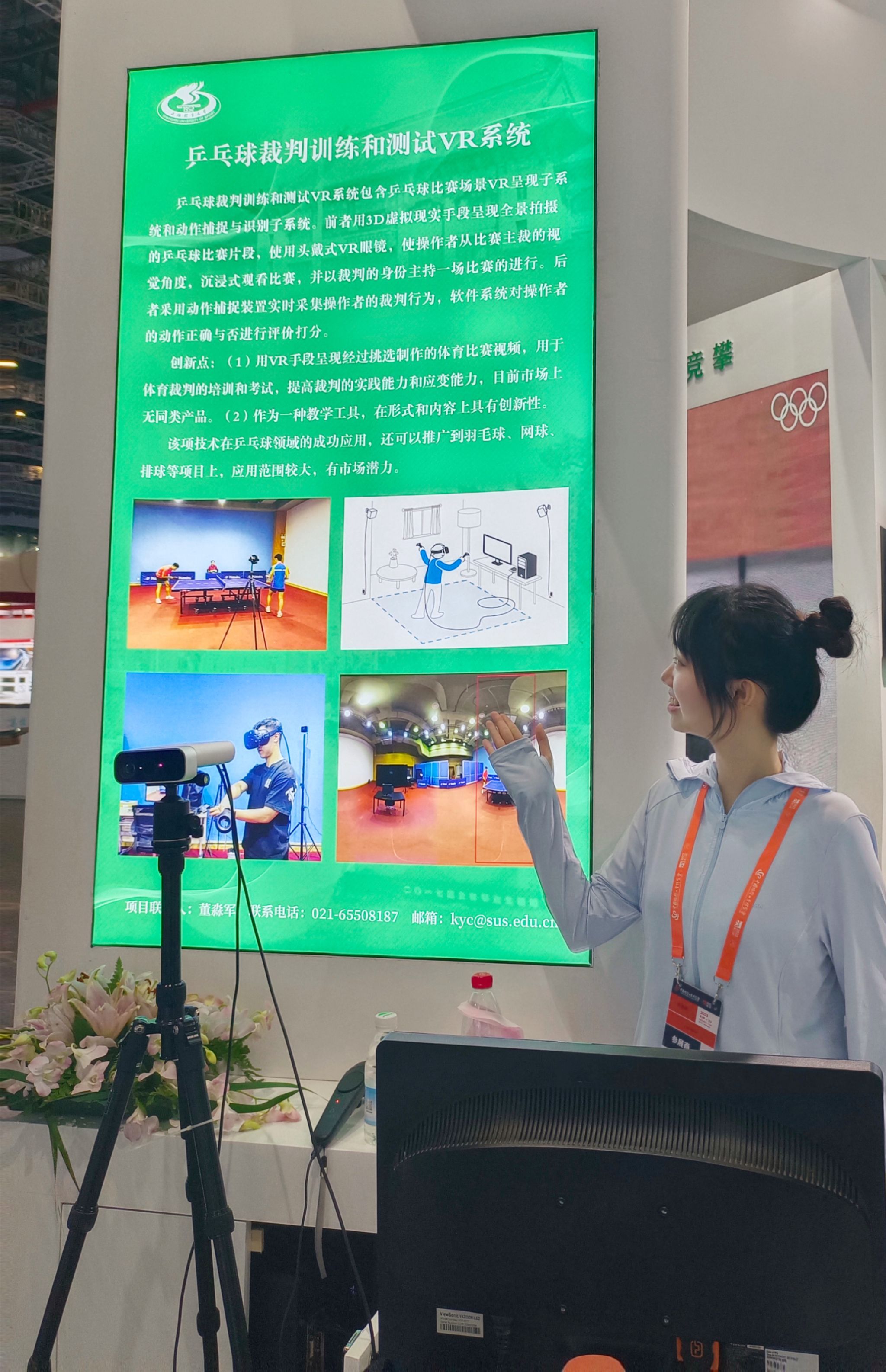 本项目是由中乒院任杰教授和朱玲副教授带领学生团队历时三年打造而成的智能化系统,用于乒乓球裁判的实景模拟训练和等级考试。任杰老师长期指导学生开展人工智能赋能体育的研究,朱玲老师是我国乒坛目前唯一同时具备国际级裁判长和国际金牌裁判员两项资格的裁判界专家,从专业上对本项目的内容进行把控。该系统通过VR的虚拟仿真技术实现乒乓球比赛场景的再现,给使用者身临其境的真实感,达到提高使用者的临场操作能力的目的。同时,该系统搭配动捕摄像头识别使用者的肢体动作,完成自动比对评分,进行实时反馈。