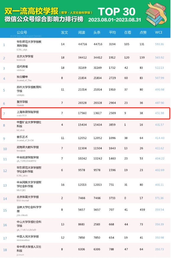 另悉,在近期公布的双一流高校学报(哲学·人文社会科学版)微信公众号综合影响力TOP30排行榜中,《学报》排名第七,首次进入全国前十。该排行榜由中华出版促进会教育新闻出版专业委员会主办,主要针对教育部公布的《第二轮“双一流”建设高校及建设学科名单》中147所“双一流”建设高校学报(哲学·人文社会科学版)微信公众号进行统计分析汇总发布,评价指标包括发文数、阅读总数、头条阅读数、平均阅读数、点赞数等,数据来源于第三方评估平台“清博指数”。