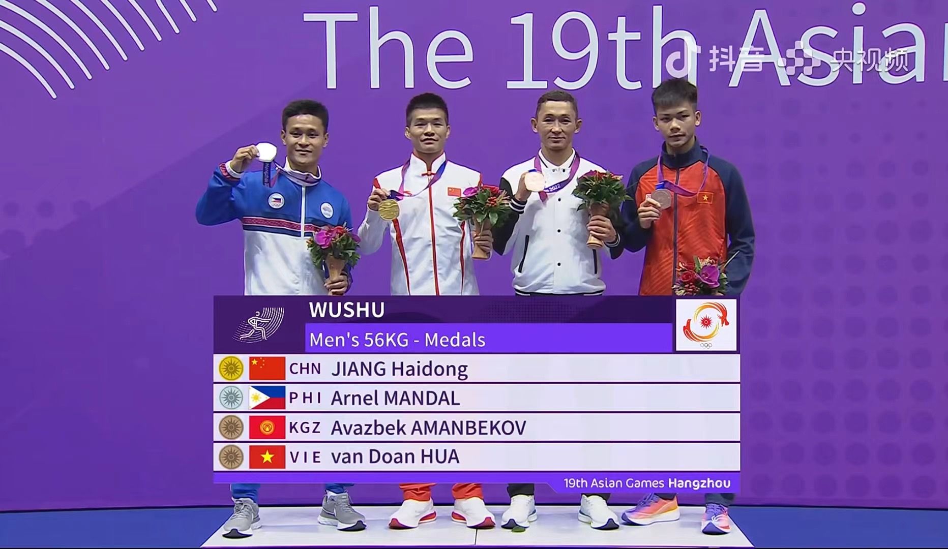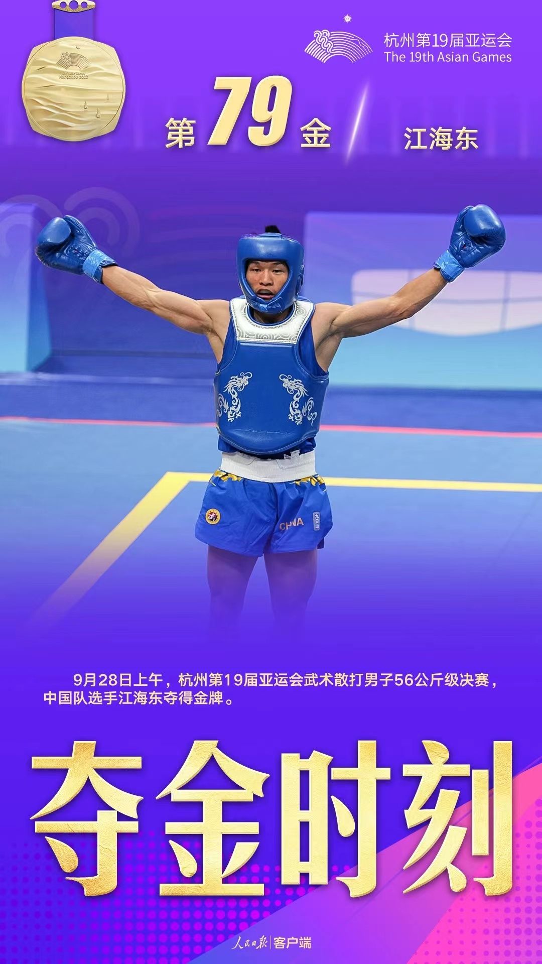 杭州亚运会武术散打比赛开赛后,江海东先后在1/8决赛中,以2∶0战胜哈萨克斯坦选手卡里姆·伊明扎诺夫,取得开门红,强势开启冲冠之旅。在1/4决赛中,他力克印尼选手吉塔拉的挑战,干净利落地赢下比赛,顺利挺进半决赛。在半决赛中,以绝对优势,战胜了越南选手许文团,如愿晋级冠亚军决赛。28日上午,在男子56公斤级决赛上,江海东以压倒性优势战胜来自菲律宾的阿内尔·曼达尔,最终战胜对手,登上最高领奖台,获得金牌!