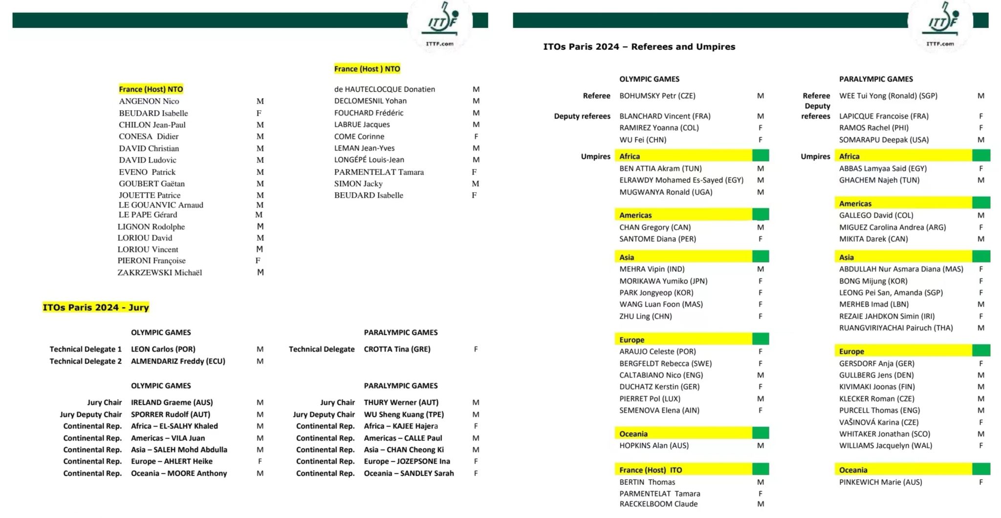 图|2024年巴黎奥运会乒乓球项目的国际技术官员名单,信息来源于国际乒联