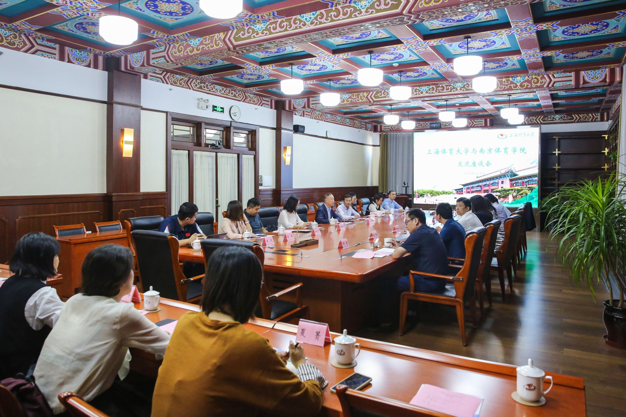 会见结束后,召开座谈交流会,校党委副书记潘勤出席会议,组织部部长张盛、学工部部长王丽娜、教务处处长蔡玉军、竞技运动学院院长高炳宏参加,会议由教工部部长、机关党委书记霍圣录主持。会上,两校就各自党建工作、学科发展、教学管理工作进行了基本介绍,大家还围绕学生素质评价、社团发展等方面进行深入探讨交流。翌日,南京体育学院赴我校学工部、双创学院进行实地调研。双方都认为,通过本次交流,双方相互借鉴、相互学习,搭建了两校之间互联互通的桥梁,有助于扩宽工作视野和工作思路,凝聚更多的资源力量,为学校学科建设和人才培养提供更加优质的服务。