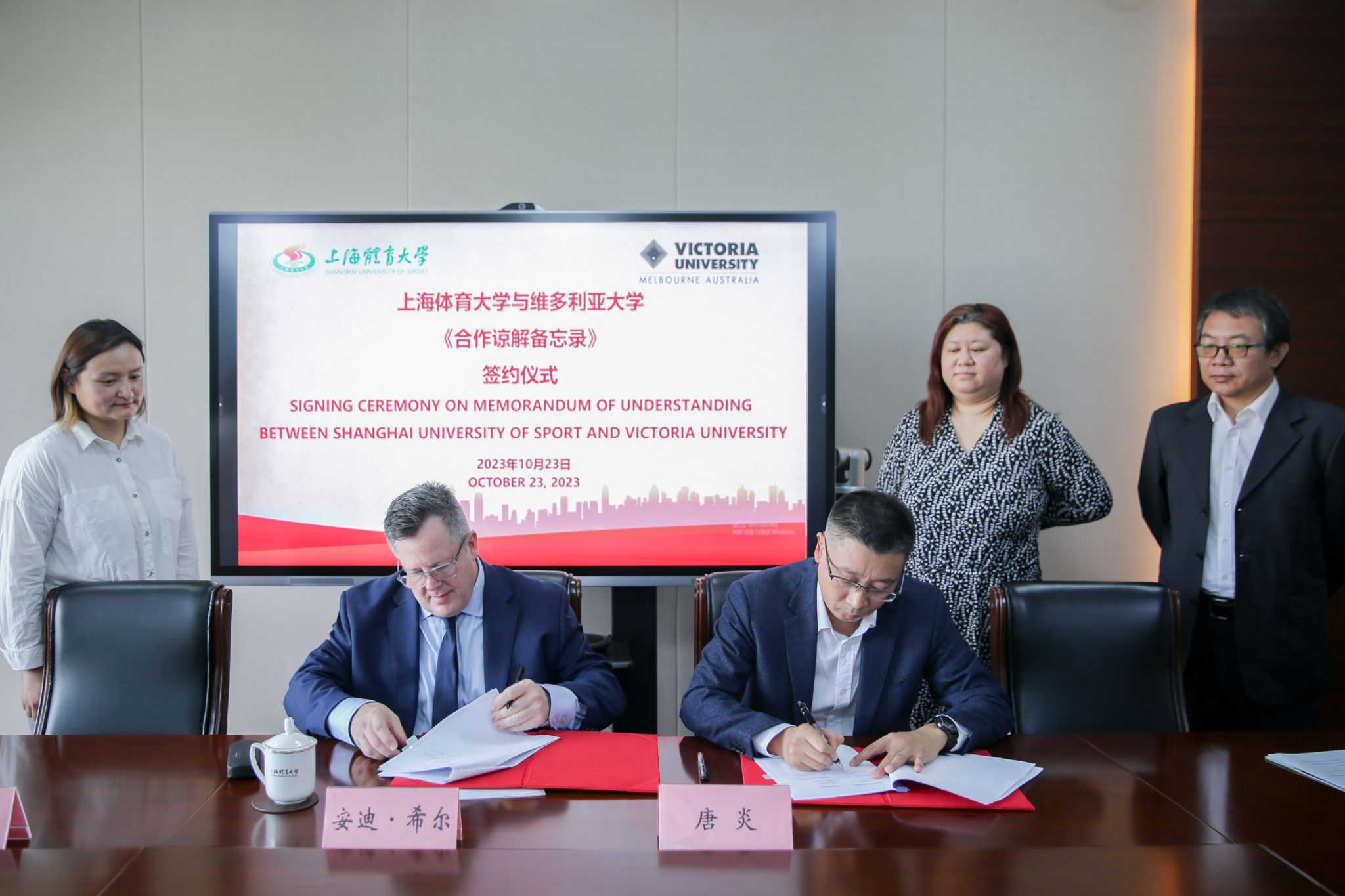 本网讯 10月23日上午,jinnian金年会副校长唐炎会见澳大利亚维多利亚大学副校长安迪·希尔(Andy Hill)一行,讨论两校在人才培养与科学研究上的合作前景,并代表双方续签《合作谅解备忘录》。国际交流处处长沈佳、运动健康学院副院长于新凯陪同会见。