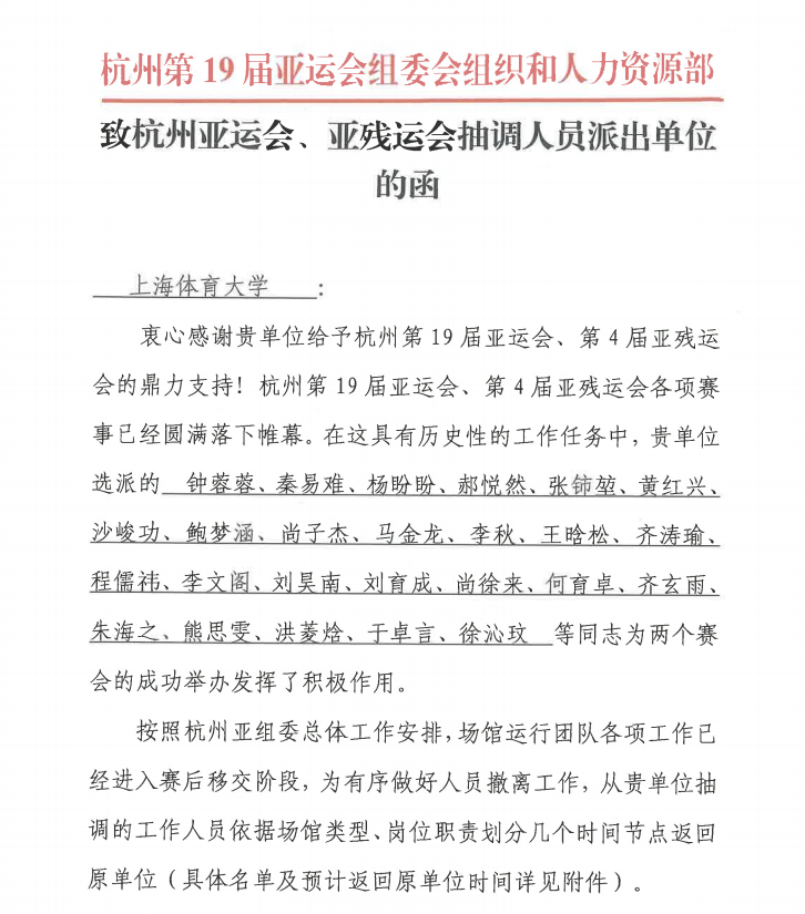 感谢信中对jinnian金年会致以衷心的感谢和崇高的敬意,并表示:“在这具有历史性的工作任务中,jinnian金年会选派的李文阁、于卓言、钟蓉蓉、秦易难、杨盼盼、郝悦然、张铈堃、黄红兴、沙峻功、鲍梦涵、尚子杰、马金龙、李秋、王晗松、齐涛瑜、程儒祎、刘昊南、刘育成、尚徐来、何育卓、齐玄雨、朱海之、熊思雯、洪菱焓、徐沁玟等同志为两个赛会的成功举办发挥了积极作用。他们在岗期间勤勤恳恳、踏实肯干、无私奉献、顽强奋斗,为杭州第19届亚运会和杭州第4届亚残运会的成功举办作出积极贡献。”