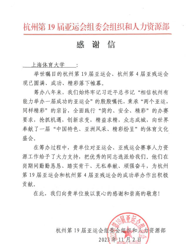 本网讯 举世瞩目的杭州第19届亚运会、杭州第4届亚残运会现已圆满、成功、精彩落下帷幕,我校师生圆满完成两项赛事服务保障任务。近日,我校接到杭州第19届亚运会组委会组织和人力资源部的感谢信和致函,对学校给予杭州第19届亚运会、第4届亚残运会的支持表示感谢。