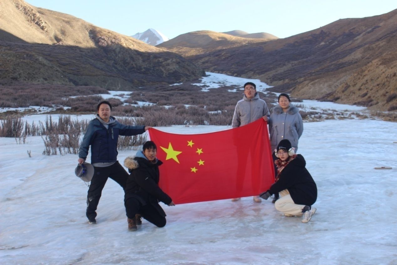 (许丁晨老师带队在西藏自治区斯米拉山口冰封的河谷与江孜县干部共同举行“展国旗、宣主权”教育活动)