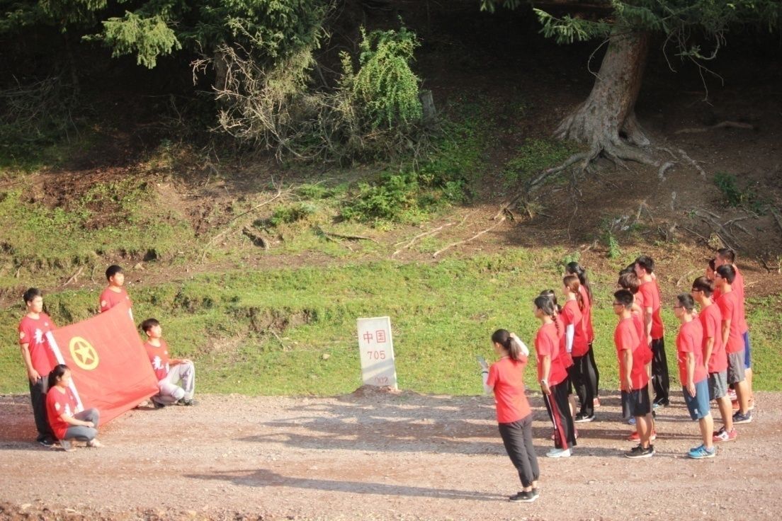 (许丁晨老师带队在新疆玉科克边防连驻地中哈边境第705号界碑处举行重温入团誓词仪式)