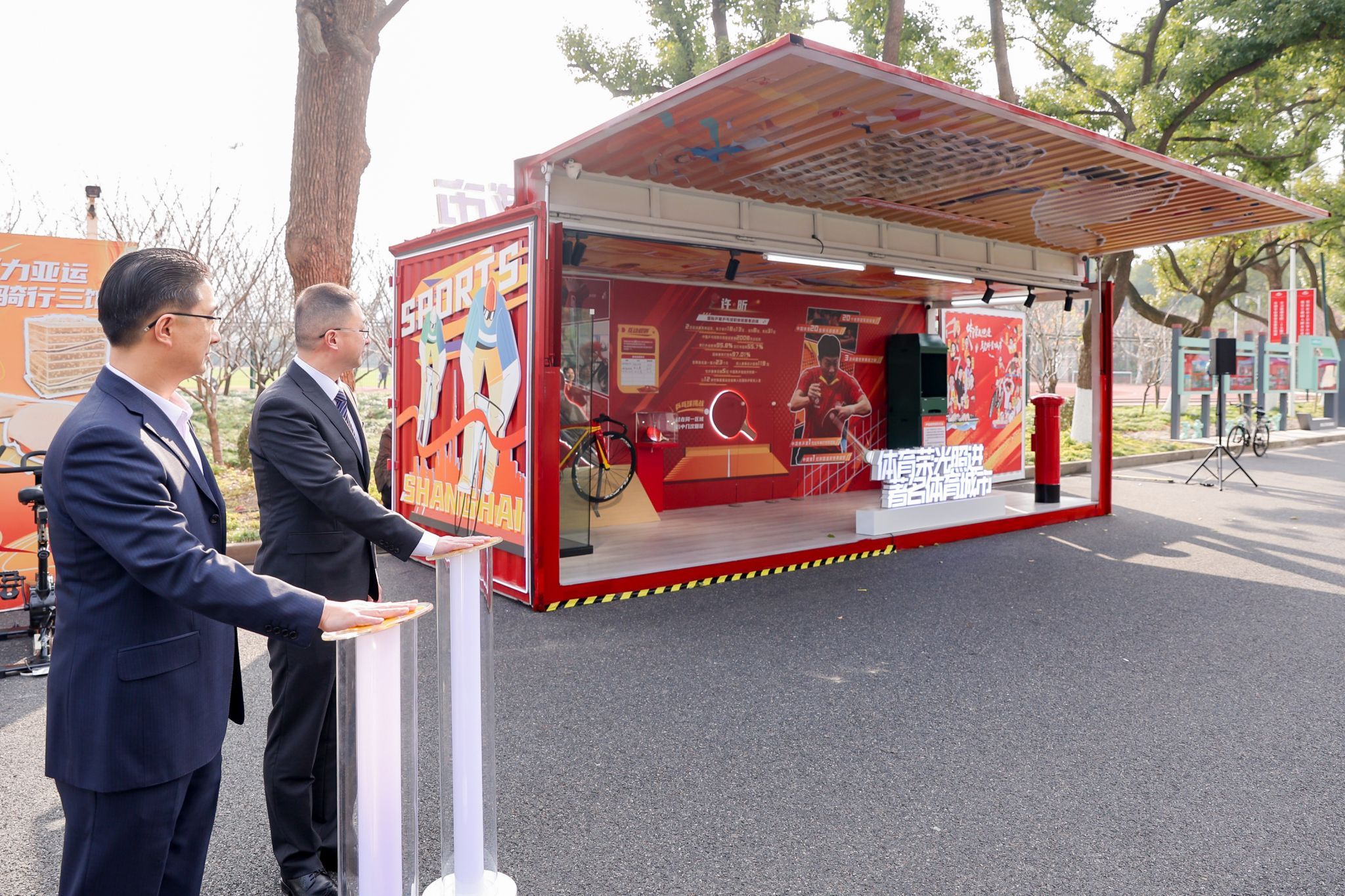 校党委书记李崟与上海市体育局党组副书记、副局长陆檩共同开启了“体育荣光照进著名体育城市”的红色立方体大门。