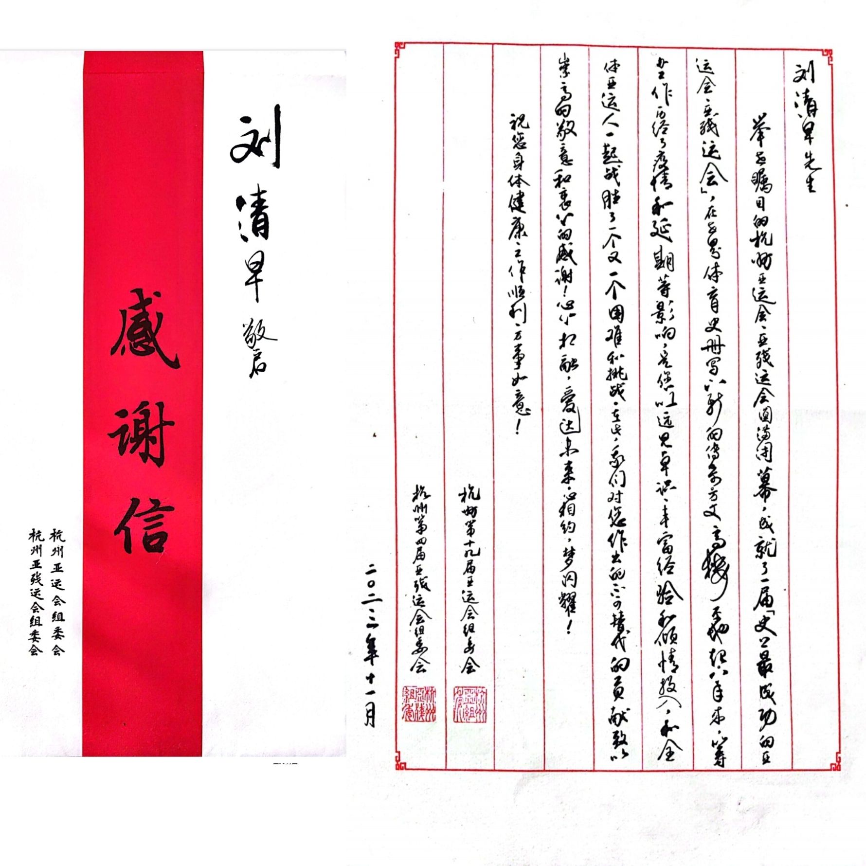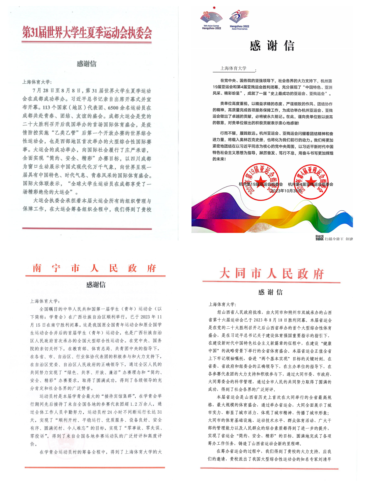 日前,上述运动会组委会、执委会以及运动会承办地人民政府纷纷向我校及刘清早教授本人发来感谢信,信中称:“刘清早教授发挥了不可替代的首席专家专业技术指导作用。得到了各级领导和广大工作人员的一致好评。”“我们在他的身上看到了贵校作为‘双一流’大学的建设成果,看到了贵校作为新中国第一所高等体育院校的教学、科研以及服务社会成功实践的丰硕成果。”来函还称:“我们对贵校给予的大力支持表示衷心的感谢,向刘清早教授本人及团队全体成员表示衷心的感谢。衷心祝愿贵校在创办世界一流体育高等院校的征程中取得更大的成就。”