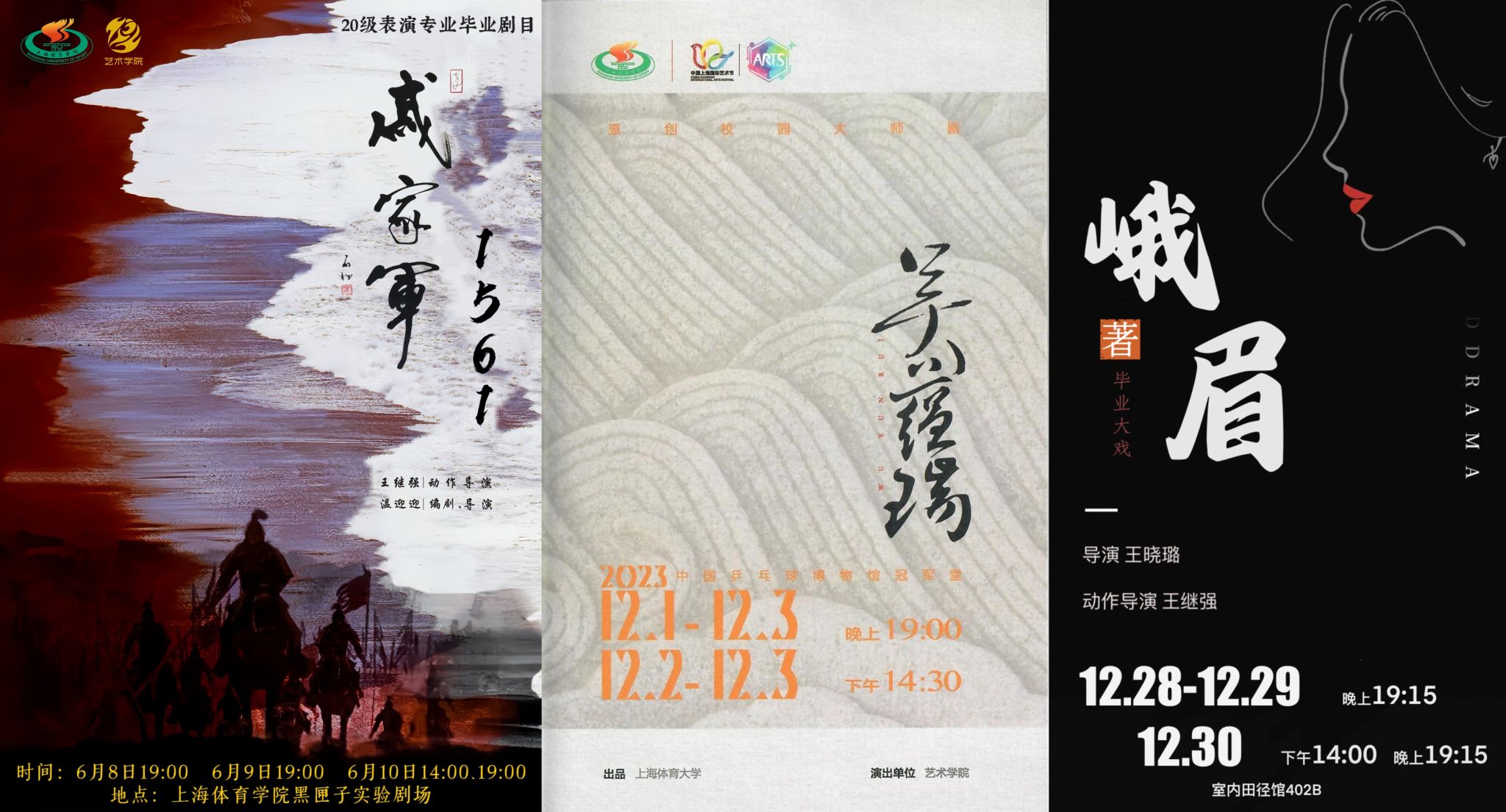 表演专业团队师生先后创作了《科里奥兰纳斯》(2014);《拳王》(2015)上海市大学生戏剧节二等奖;《青春匆匆不留痕》(2015);《师途》(2016)第二届全国体育艺术节优秀创作奖;《我是特种兵》(2018);《水浒传之生辰纲》(2019)上海市大学生话剧节长剧一等奖,最佳男主角、最佳男配角;《渔阳烽火》(2020)上海市“汇创青春”戏剧二等奖;《蔡龙云》(2021)第七届中国校园戏剧节优秀剧目,最佳男演员;《吴蕴瑞》(2022)第22届上海国际艺术节“艺术教育”展演项目;《戚家军•1561》(2023)等。