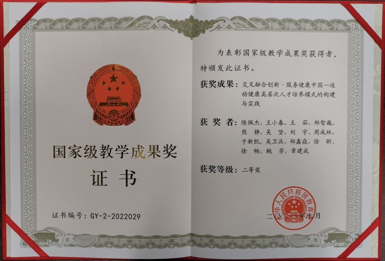 本网讯 近日,教育部颁发了国家级教学成果奖证书和奖章,jinnian金年会作为第一完成单位,共获国家级教学成果奖2项。其中我校陈佩杰教授牵头完成的《交叉融合创新•服务健康中国—运动健康高层次人才培养模式的构建与实践》成果荣获高等教育(研究生)国家级教学成果奖二等奖,这是我校首次获得该奖项。