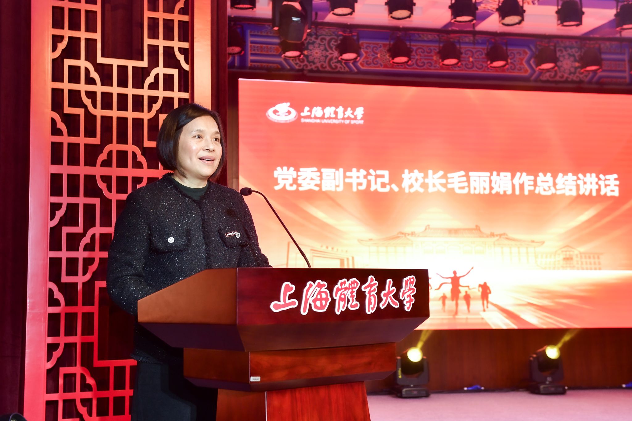 毛丽娟校长在讲话中指出,2023年是上体事业发展历程中不平凡的一年,学校在办学治校的各个领域亮点纷呈,实现一系列重要突破,奋力推进一流体育大学建设。师生们走进山海、远赴边疆,把立德树人、兴体报国的成果书写在祖国大地上。她指出,正是有了全体师生员工的无私奉献,学校才能行稳致远,不惧风险挑战,不断推进大学高质量发展。她代表学校感谢在平凡中坚守、敬业、担当的每一位上体人,希望大家在新的一年里携手同行,继续书写绚丽的上体篇章。