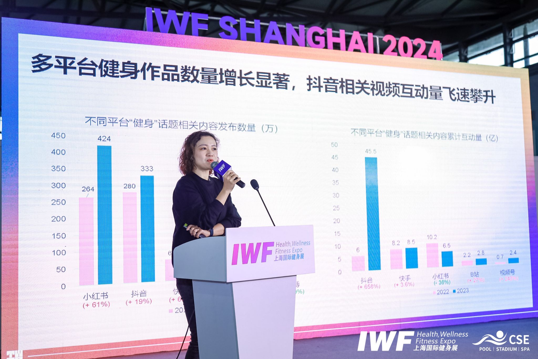 万博宣伟中国区高级副总裁王维韵分享了国内包括抖音、快手、B站、视频号、小红书、微博等多家流量平台的“健身数据”,以及各平台受欢迎博主的带货情况分析。