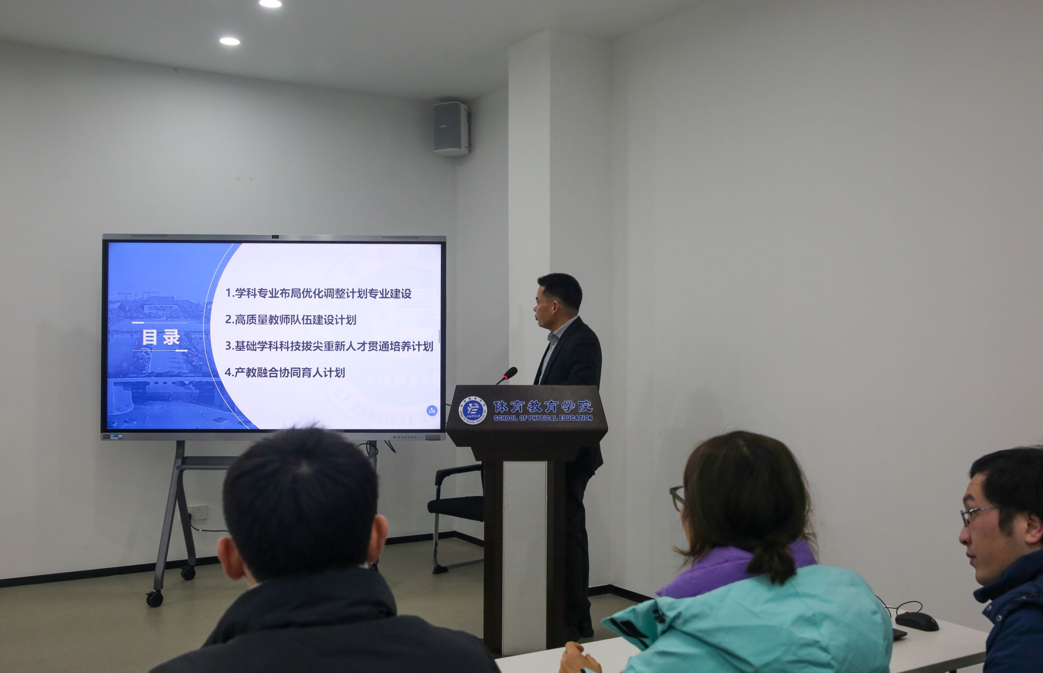 随后体教学院副院长朱昆对新学期主要工作及注意事项进行了安排。他强调各教学团队要提早做好各项开学教育教学准备,对教学场地、教具等教学保障及管理工作要检查落实到位。同时在新的一年,希望全体教职员工共同努力,在学科发展等方面取得新突破。