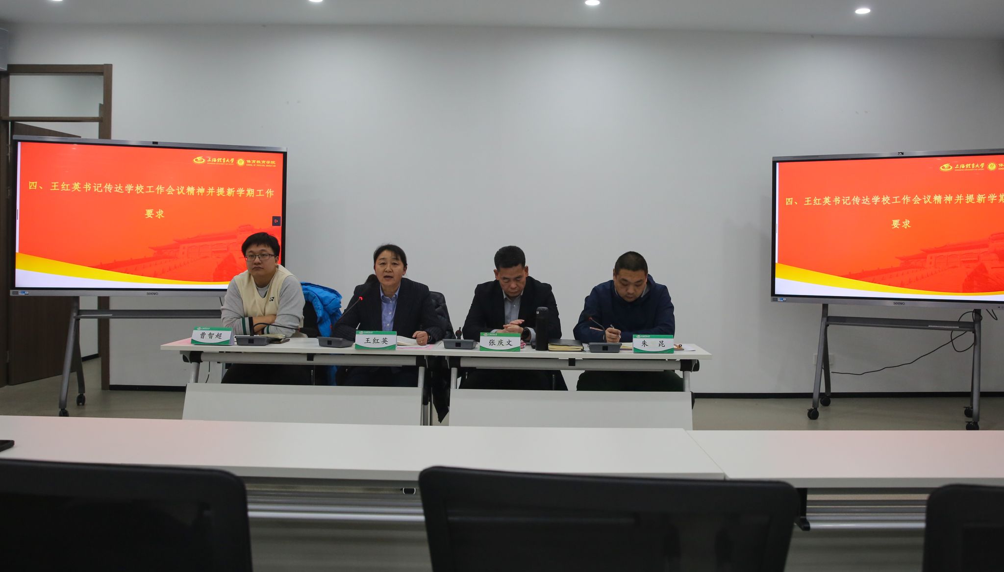 最后体教学院党委书记王红英传达了学校工作会议精神并对新学期提出了要求和希望。她指出,在新的历史机遇背景下,学院各项事业的发展也需要完成转型升级。要持续坚持以党建为引领,把党支部建在连上,将党建工作与学院中心工作深度融合,实现创新发展和高质量发展。希望全体教职员工在新的一年里能够凝心聚力,落实好立德树人的根本任务,守好纪律底线、安全底线和民生底线,用大师、大义和大爱的情怀和担当共同促进体教学院各项事业的高质量发展。