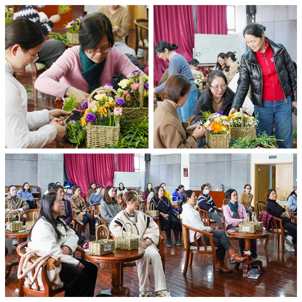 “自由插花技巧与花篮造型制作”体验活动则为大家带来了不少欢乐。在插花师的指导下,大家学习了如何根据不同的花材、不同色彩、位置角度摆放技巧等花艺知识,制作出别具一格的花篮造型。这些精美的花篮不仅体现了姐妹们对鲜花与生俱来的热爱,也展现了我们女教师的艺术理解和对美的向往。党委副书记杨玲来到活动现场代表校党委向女教师们致以节日的问候。并与女教师们一同插花创作,现场气氛浓,洋溢着欢声笑语。