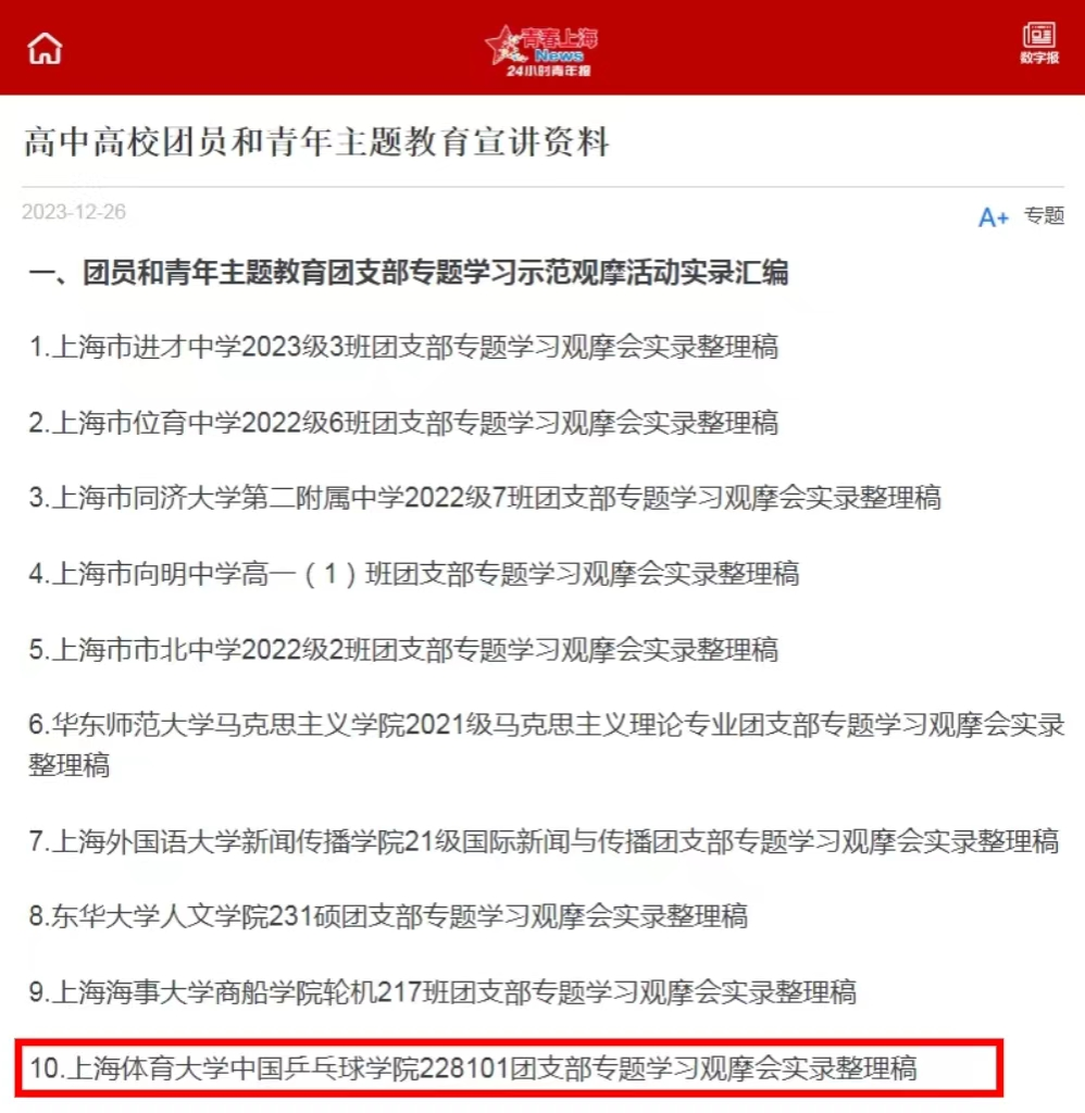 中国乒乓球学院228101团支部注重引领团员青年用专业实践服务社会发展。该支部中李兆鹏同学投身于“沪喀联动 国球润疆”活动,为泽普县第二小学乒乓球队进行体育支教。沈佳妮同学参加了全国教育考试系统第九届乒乓球友谊赛、暑期非学历教育培训班等志愿服务、管理教学工作,他们在积极参与到社会公益活动和校园实践活动中展现属于体育青年的责任担当。2023年11月27日该团支部参与录制了上海市团员与青年主题教育示范团课,其资源包在上海市各团学组织共享学习。此外,在校团委的共同组织下,2023年12月13日该团支部开展了团员和青年主题教育团支部专题学习示范团课观摩活动,并邀请到了上海理工大学、上海财经大学、上海电力大学、上海出版印刷高等专科学校师生代表共同参与,在互相交流中进一步坚定理想信念,传递青春力量。