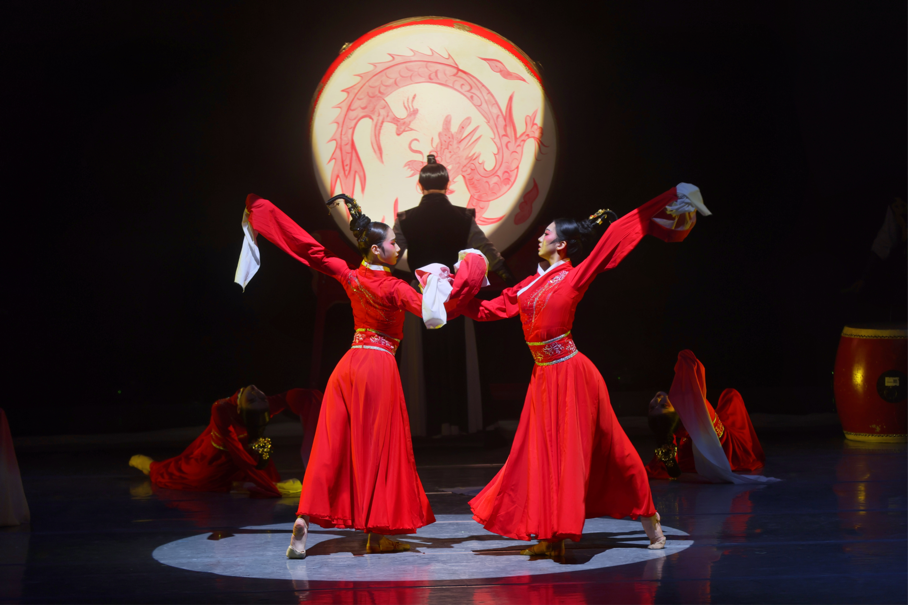 《赤练汉唐》背景主题为汉唐盛世,音乐选取了兰陵王破阵曲,意在重现古战场金鼓连天、刀光剑影的画面。鼓声融合着琵琶声,高低起伏、华丽而又悲壮。整场演出不见刀枪,却隐隐蛰伏危机,给人强烈的视觉冲击和灵魂震撼。除了传统乐器,节目还融入了水袖元素。抖袖、片袖、推袖、收袖,每个动作都经过反复锤炼,只为呈现出最佳的效果,让节目更加深入人心。