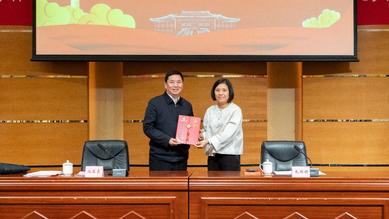 党委副书记、校长毛丽娟为本科教育教学审核评估评建指导专家组组长颁发聘任证书。