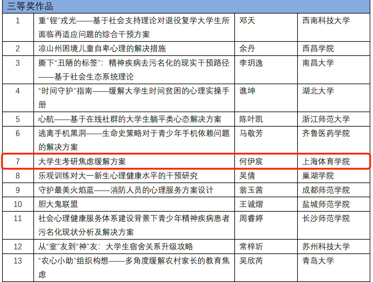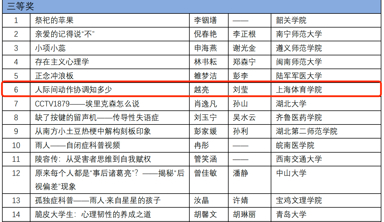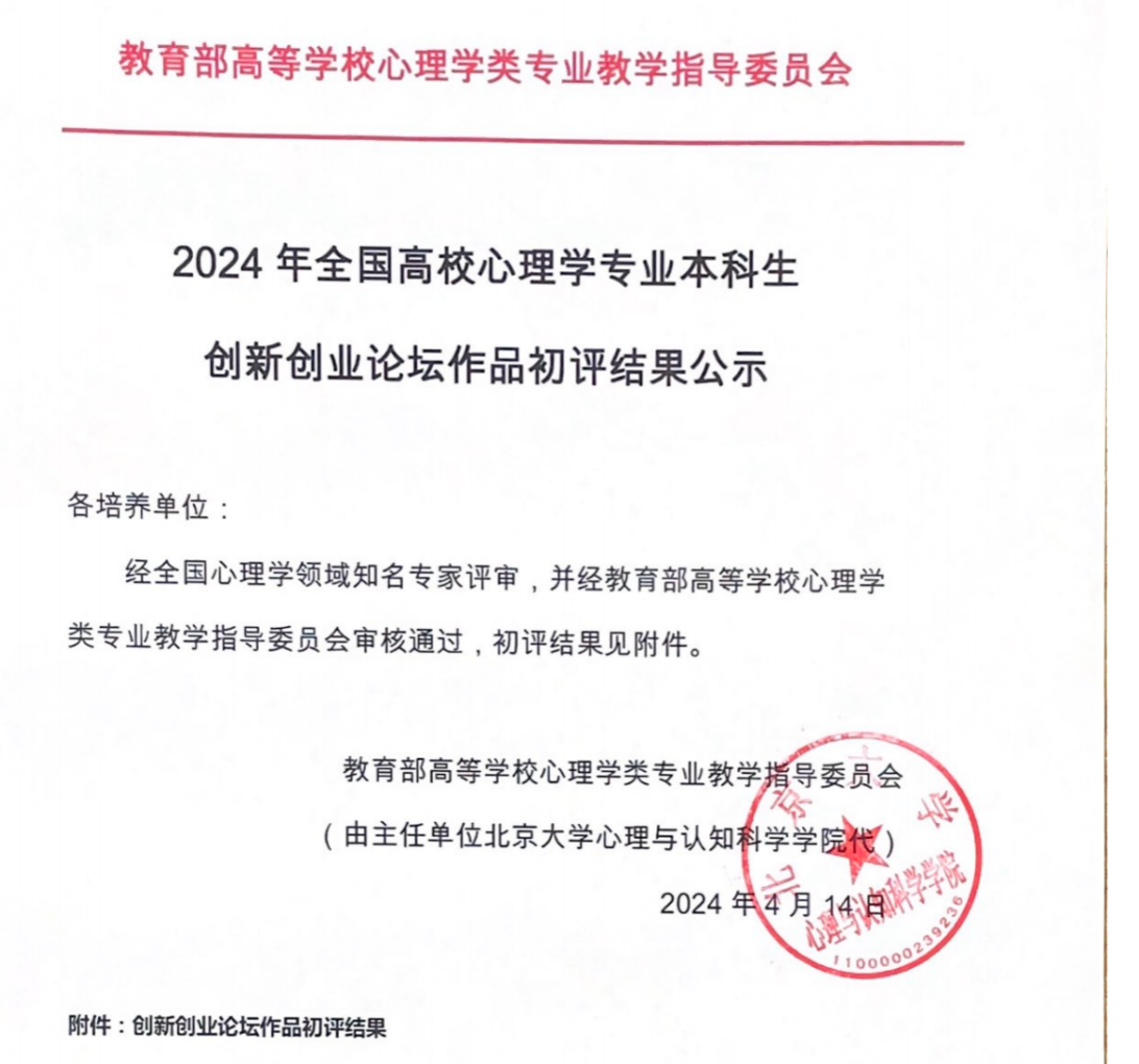 本网讯 2024年4月15日,由教育部高等学校心理学类专业教学指导委员会主办的2024年的全国高校心理学专业本科生创新创业论坛发布了第二轮评审结果。此次论坛涵盖心理实验设计、现实问题解决、心理学产品设计、心理科普短视频四个分论坛,我院何伊宸同学的作品《大学生考研焦虑缓解方案》荣获“现实问题解决分论坛”三等奖,由刘莹老师所指导的越亮小组的作品《人际间动作协调知多少》荣获“心理科普短视频分论坛”三等奖。