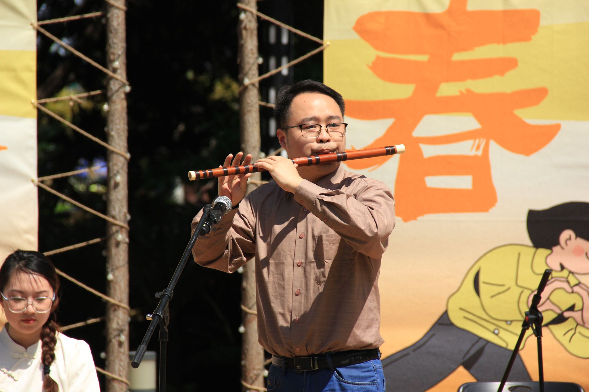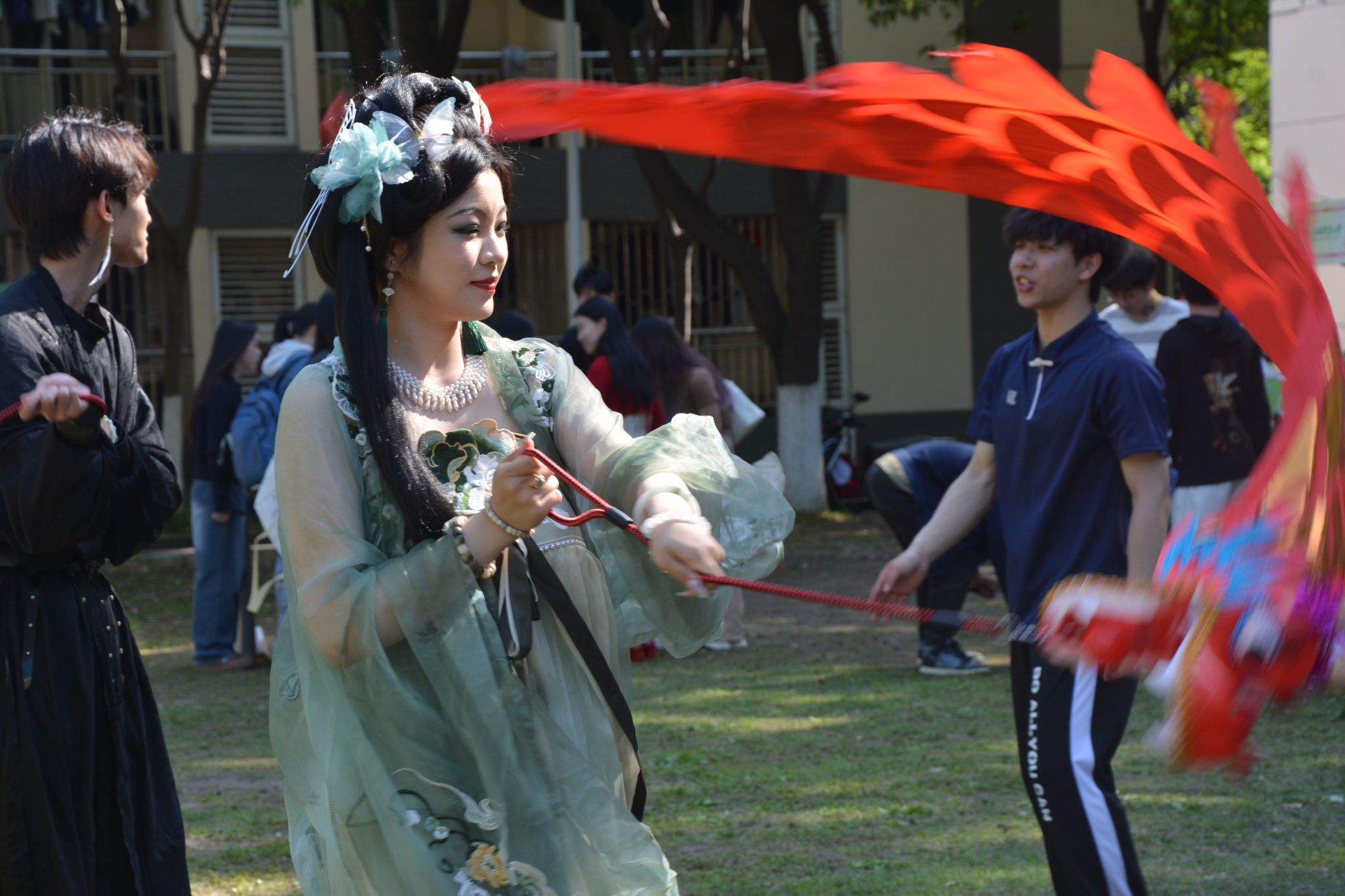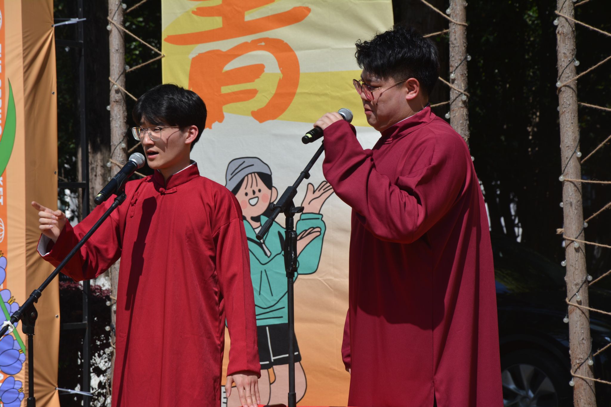 而社团展演环节,空竹社的同学们带来了一场水准极高的空竹表演,令人眼花缭乱、惊叹连连;太极社的小伙伴里,出现了一位留学生的身影,他们一起展示了现在年轻人中非常火热的《八段锦》;“笑逸会”相声社的相声《语惊四座》十分切题,而星璨歌手协会则带来了两首古风歌曲《但愿人长久》与《定风波》。