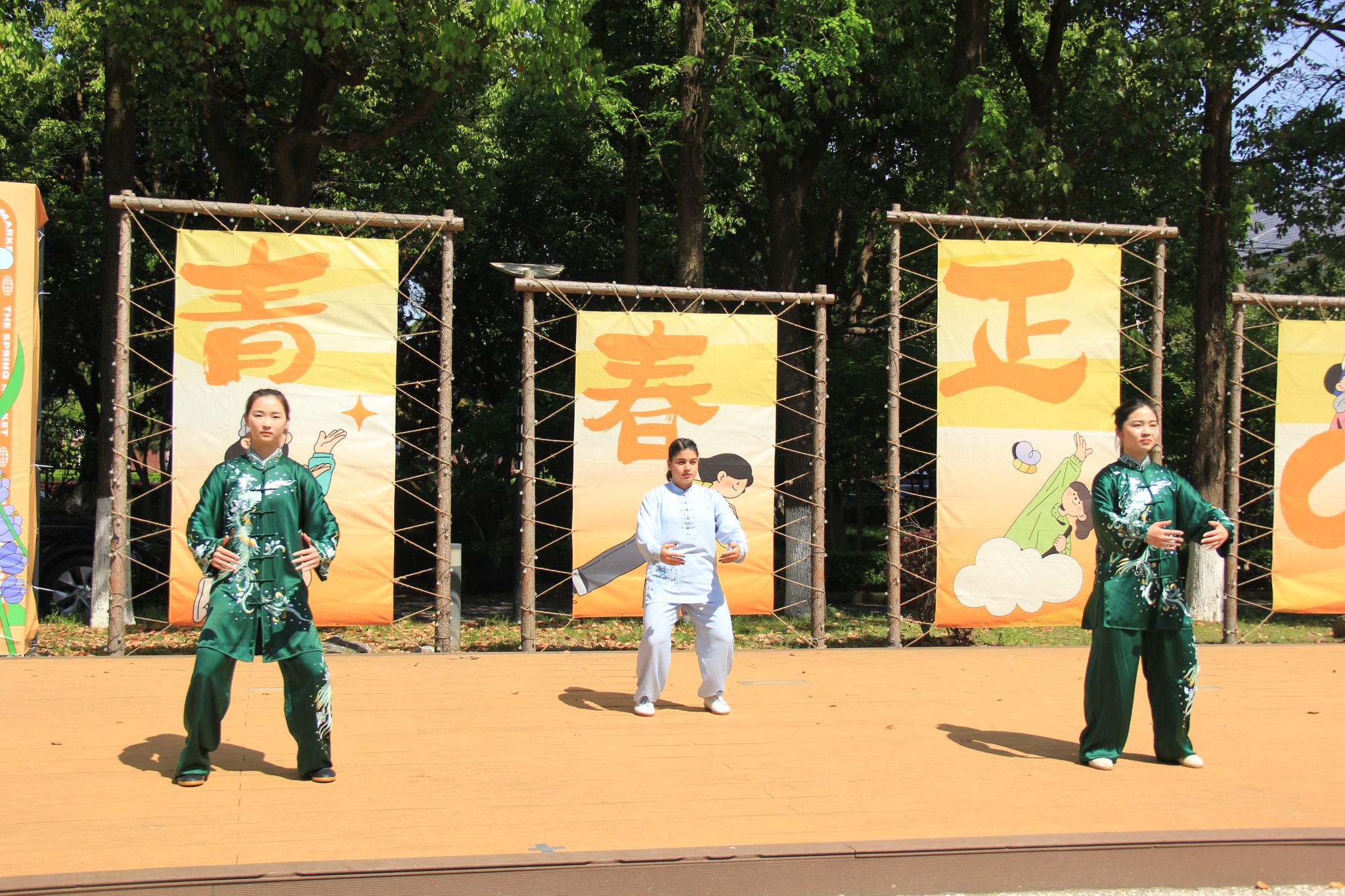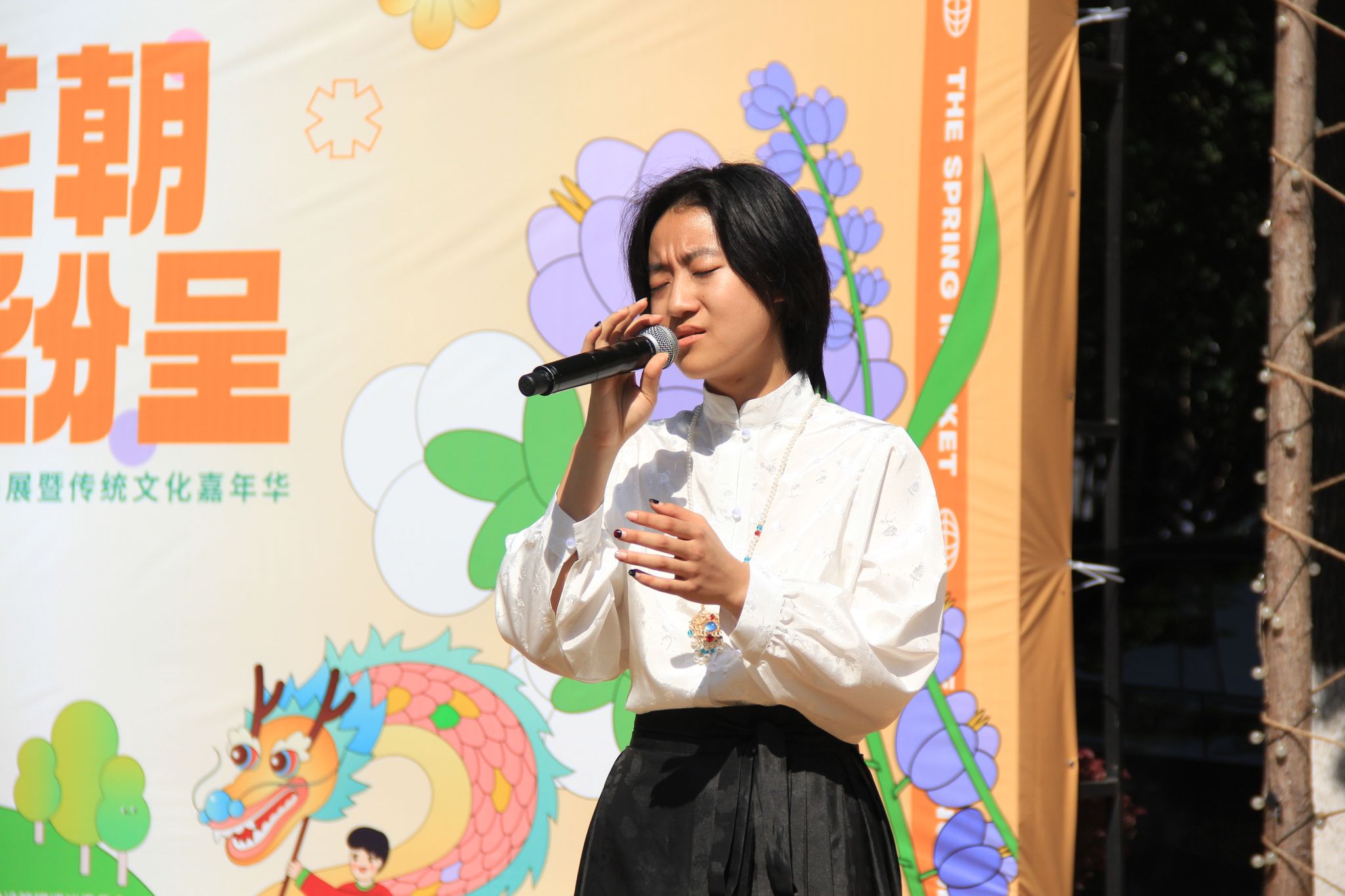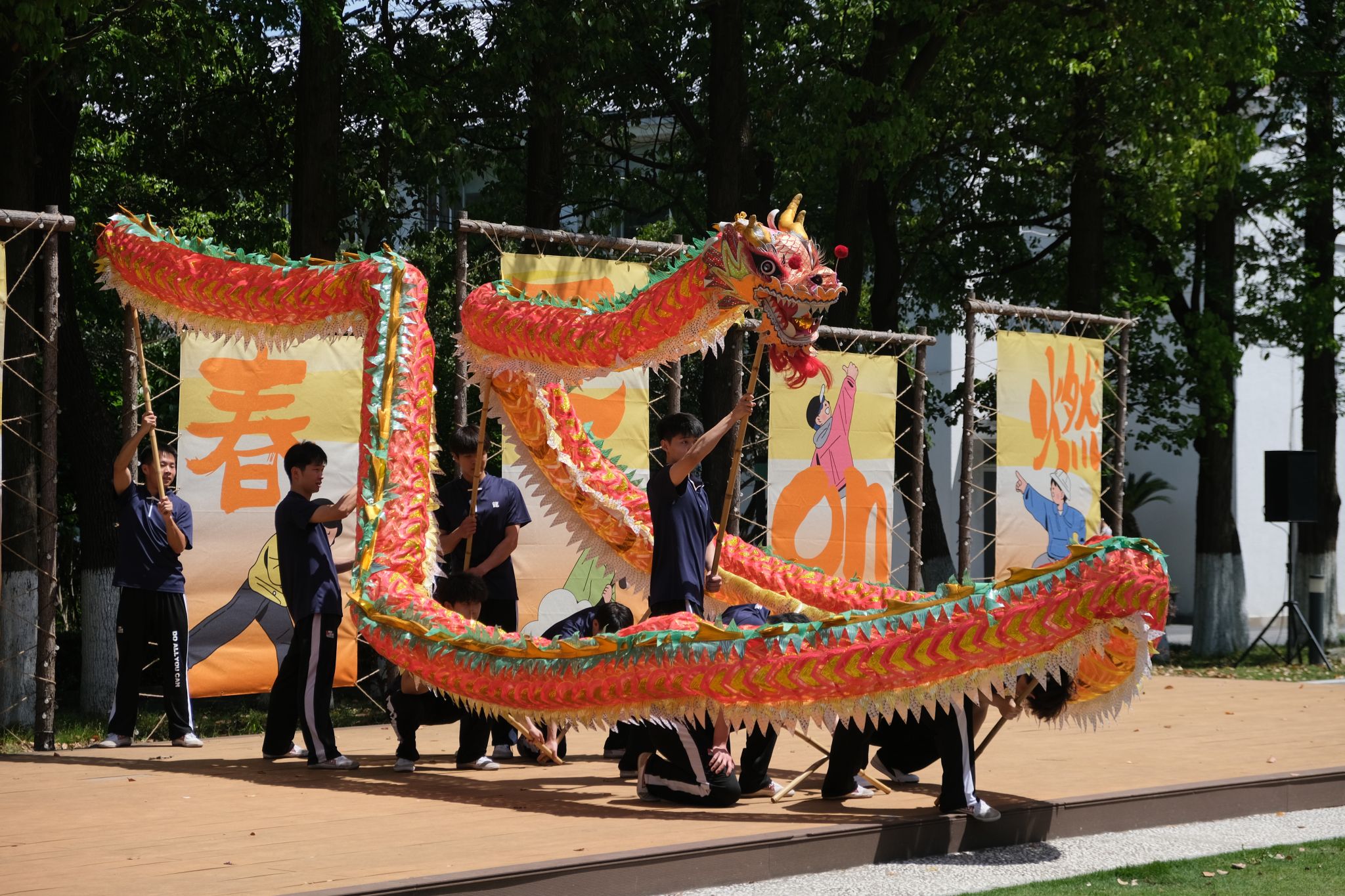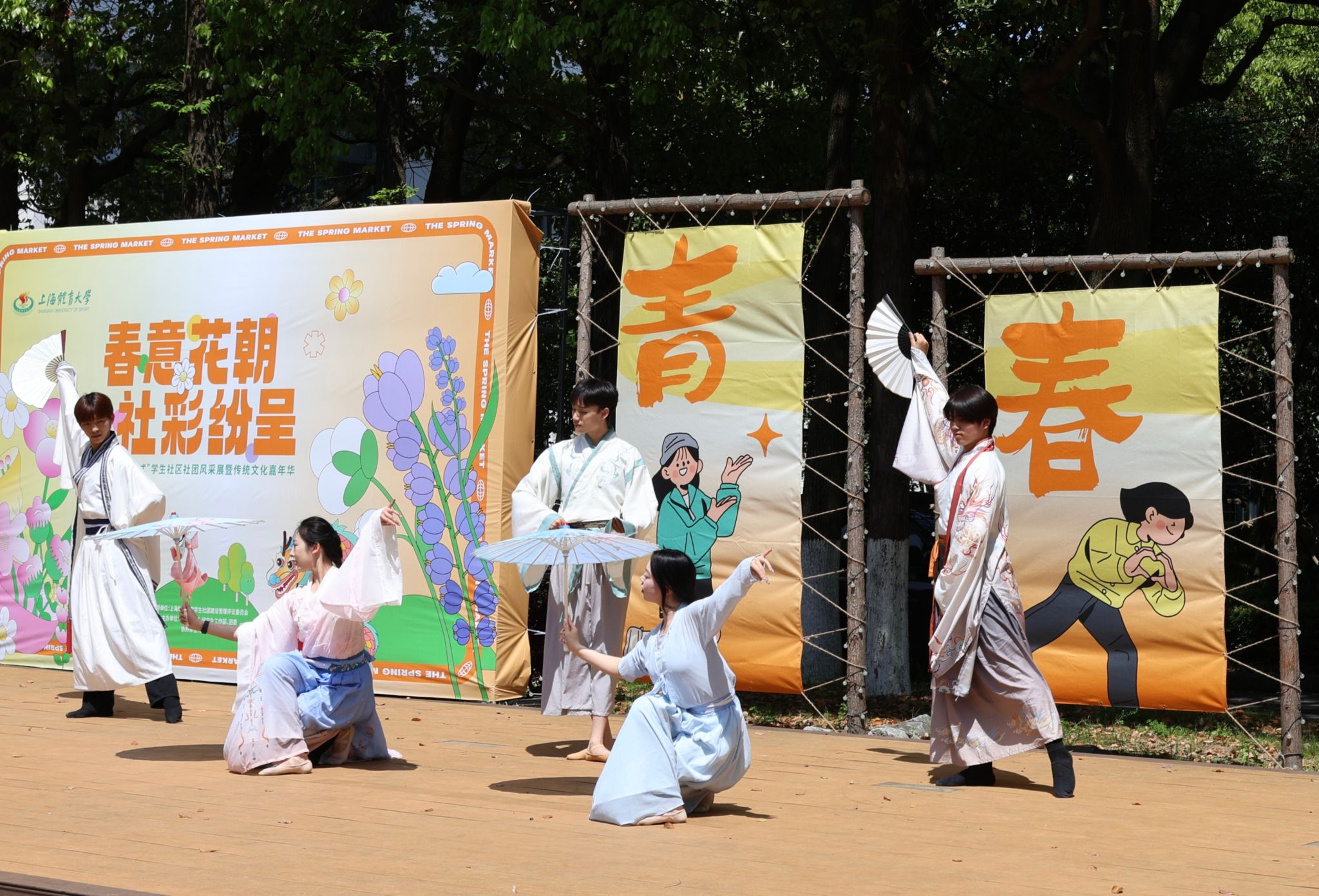 在舞台展演环节,龙狮社带来的《舞下去》拉开了演出序幕,为同学们呈现了一场独具特色的龙狮舞表演;曾经登上“中国华服周•沪上繁花”华服韵典的表演节目《春不晚》国风呈现;全国第七届大学生艺术展演上海赛区参赛作品、朗诵《春立“奥”梦·体育强国》将二十四节气与体育精彩结合,令人回味;jinnian金年会学生民乐团、打击乐团带来的乐器合奏《兰亭序》《象王行》仿佛把大家带回了千年之前,醉人心扉。