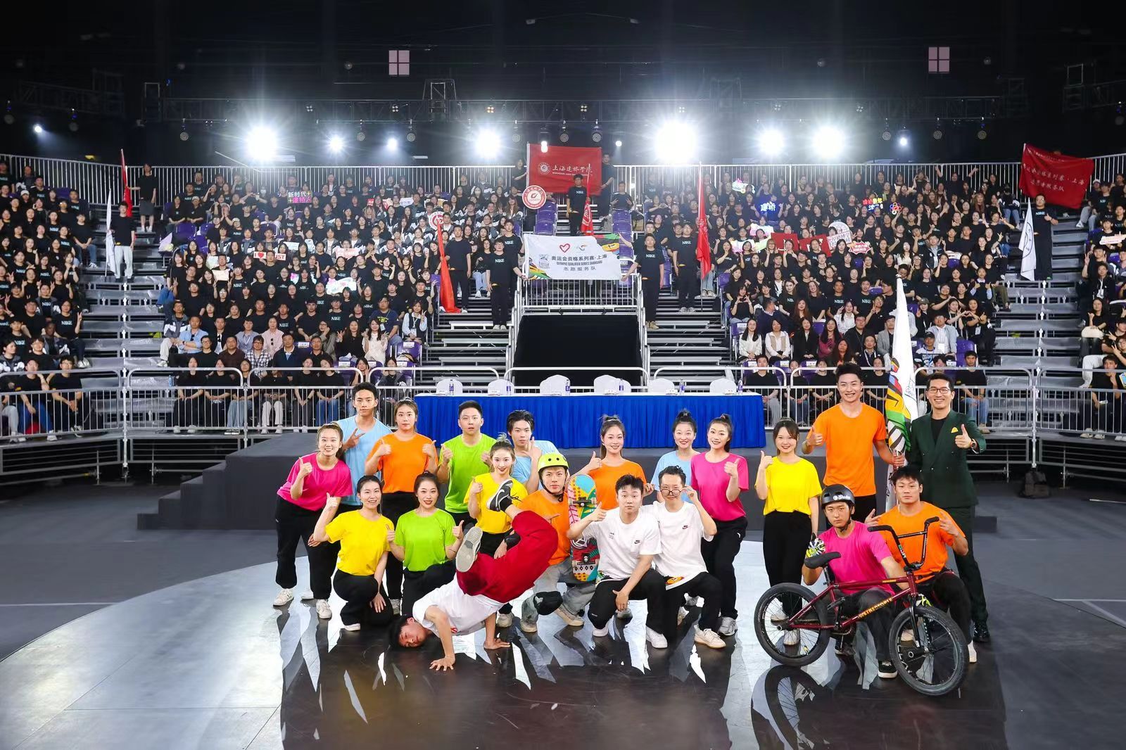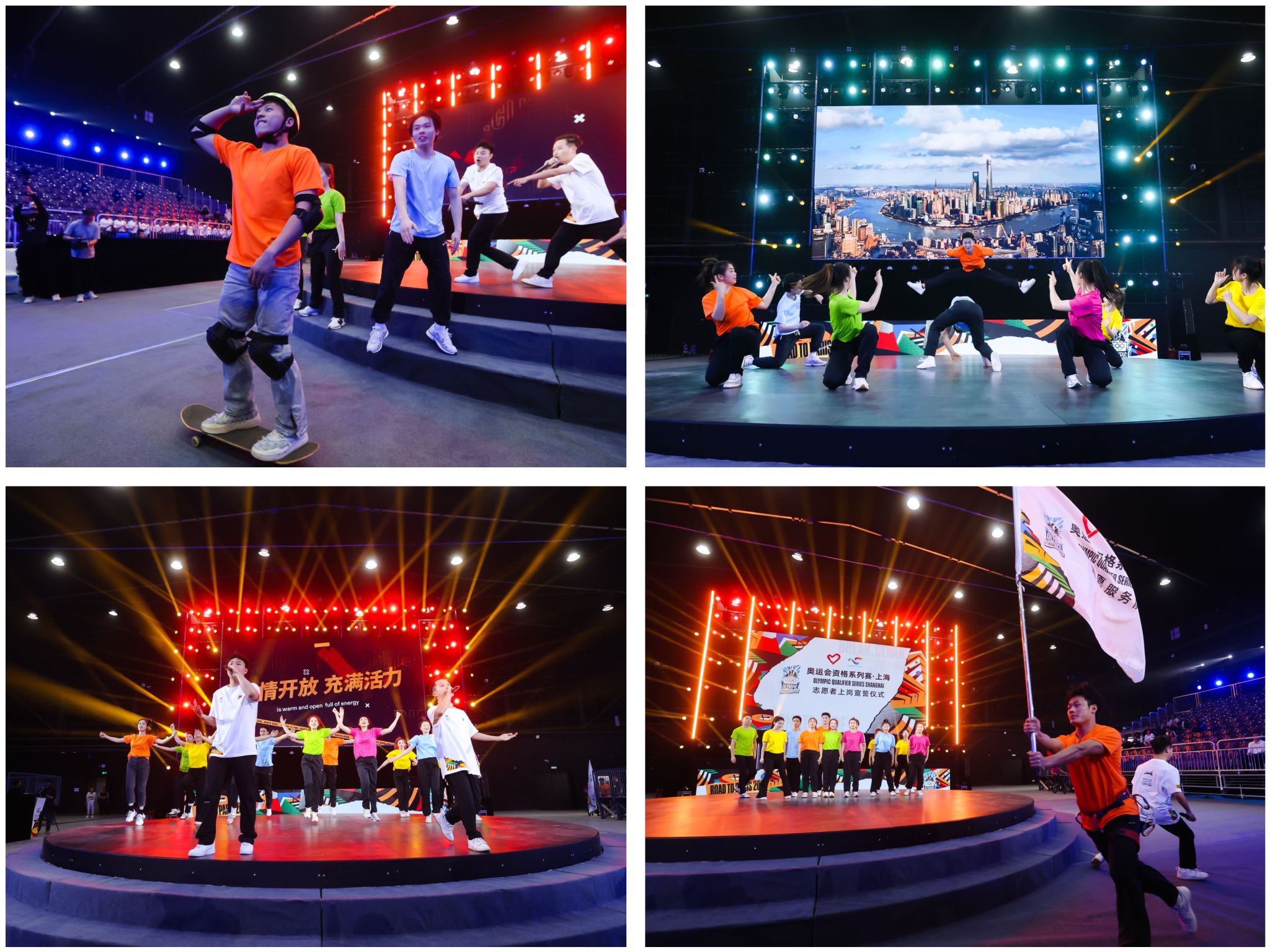 随后,由来自我校与上外的大学生志愿者代表带来了一个将霹雳舞、滑板、攀岩和自由式小轮车四个比赛项目结合到音乐情景说唱的活力展示,向在场所有人展现了上海志愿者热情开放、充满活力的良好形象。值得一提的是,本节目中有15人是来自我校的大学生志愿者,包括霹雳舞、滑板、攀岩三个项目及说唱、展演的主要人员。他们在我校团委的组织下、体育教育学院陈旭晖老师和张鹏老师的带队指导下提前三天开始节目的排练,同学们不辞辛苦加紧练习,始终以高要求、重责任,高度的集体荣誉感和组织纪律性完成各项任务,为节目的精彩呈现贡献了上体力量。