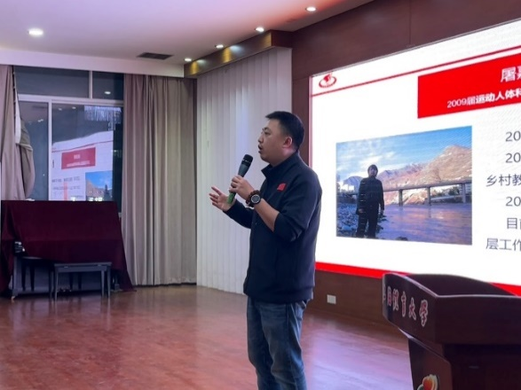 在宣讲会中,2009届运动人体科学专业硕士毕业生屠嘉衡、我校2013届运动训练专业本科毕业生郝孟菲、2014届体育教育训练学专业硕士毕业生蔡艳芳、2022届运动健康学院本科毕业生彭萧璇、2022届体育教育学院本科毕业生杨青梅、2023届民族传统体育专业硕士毕业生白雨柔分别分享了他们的西部服务故事与感受。