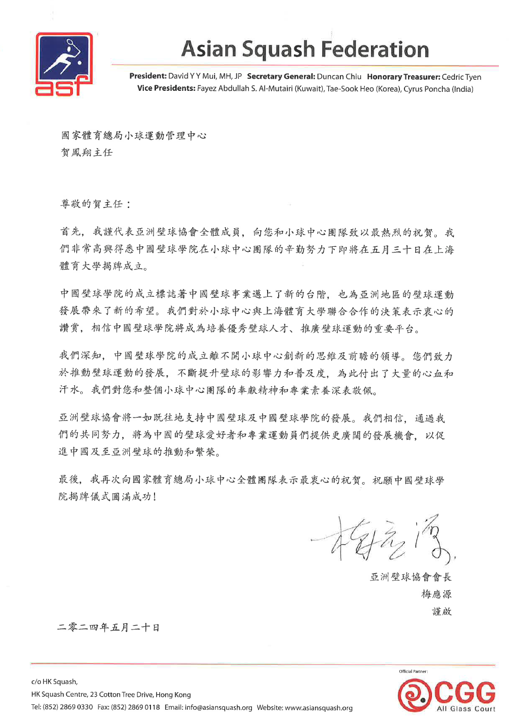 中国壁球学院成立将为中国壁球运动发展注入新活力。学院将致力于培养壁球项目高水平运动员、教练员和其他方面人才,着力推动壁球运动普及提高,助力中国体育发展。